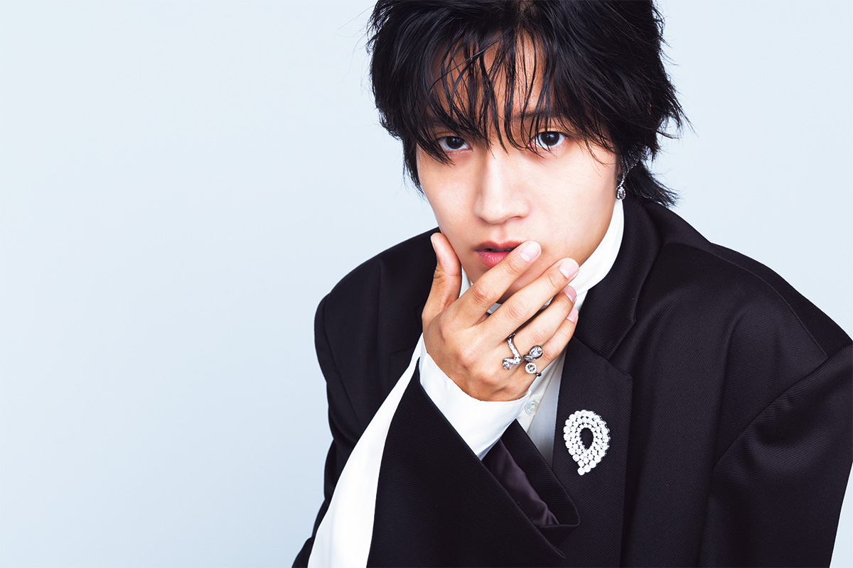 佐野晶哉さん着用:黒のロングコート¥154,000、長いタイつきのドレスシャツ¥44,000 ケイスケヨシダ(ケイスケヨシダ カンパニー・リミテッド)/ジャケットにつけたブローチ¥42,900、イヤーカフ¥44,000、右手薬指のリング¥29,700、右手小指のリング(3つセット)¥34,650 スワロフスキー・ジュエリー(スワロフスキー・ジャパン)