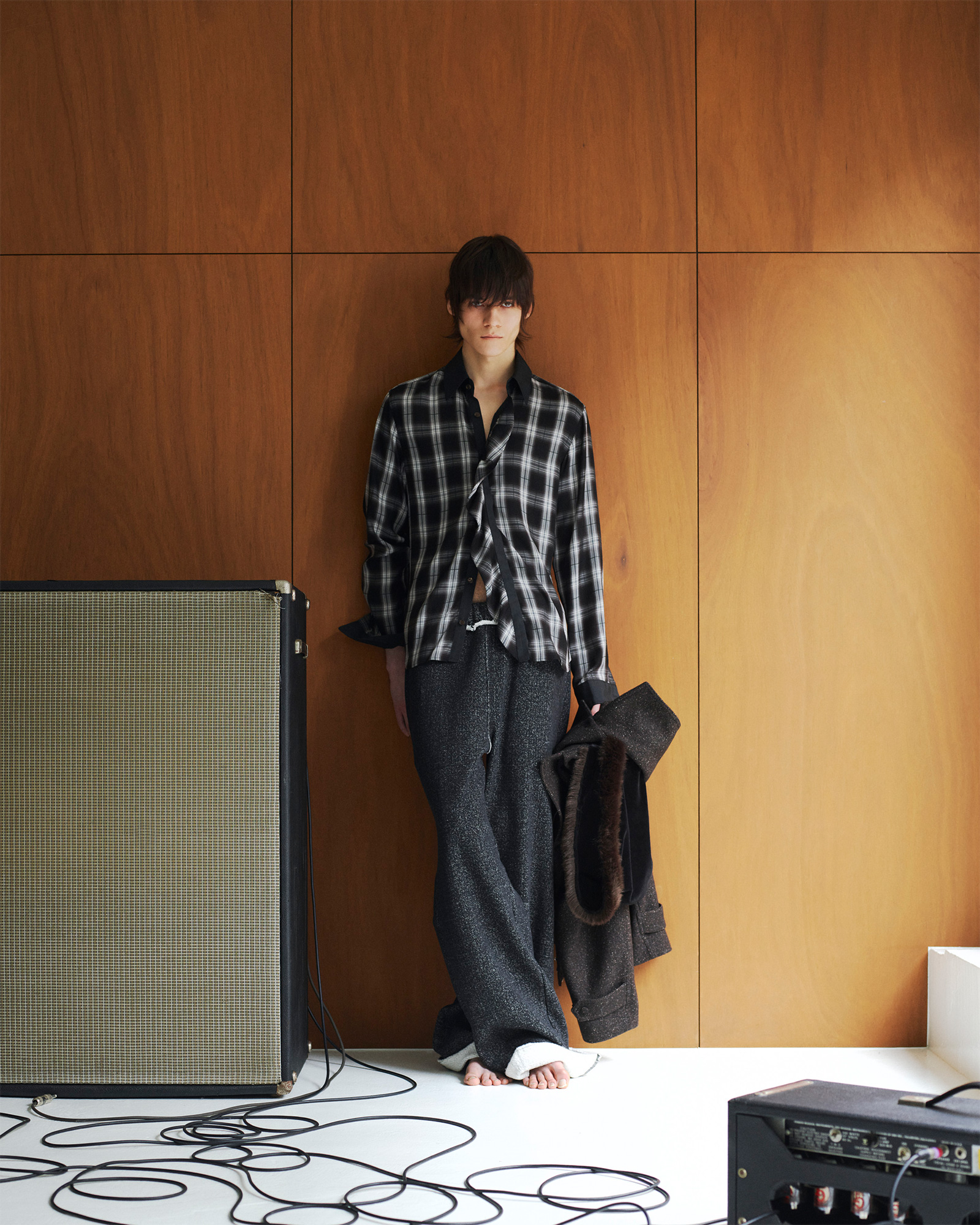 折見:アメリカのミュージシャン、パティ・スミスの写真は今シーズンの制作初期からアトリエに貼っていました。僕が敬愛するミュージシャンの一人です。彼女はテーラードジャケットや白シャツ、ネクタイといった限られたアイテムで構成される特有のスタイルが印象的で、そのイメージから、今回のコレクションはアイテムの種類を増やさず、24ルックの中でさまざまな着こなしを見せることにしました。彼女の服の着方や、クラシックなジャケットをまとったミュージシャンらしいカルチャーのニュアンスをイメージしながら制作しました。