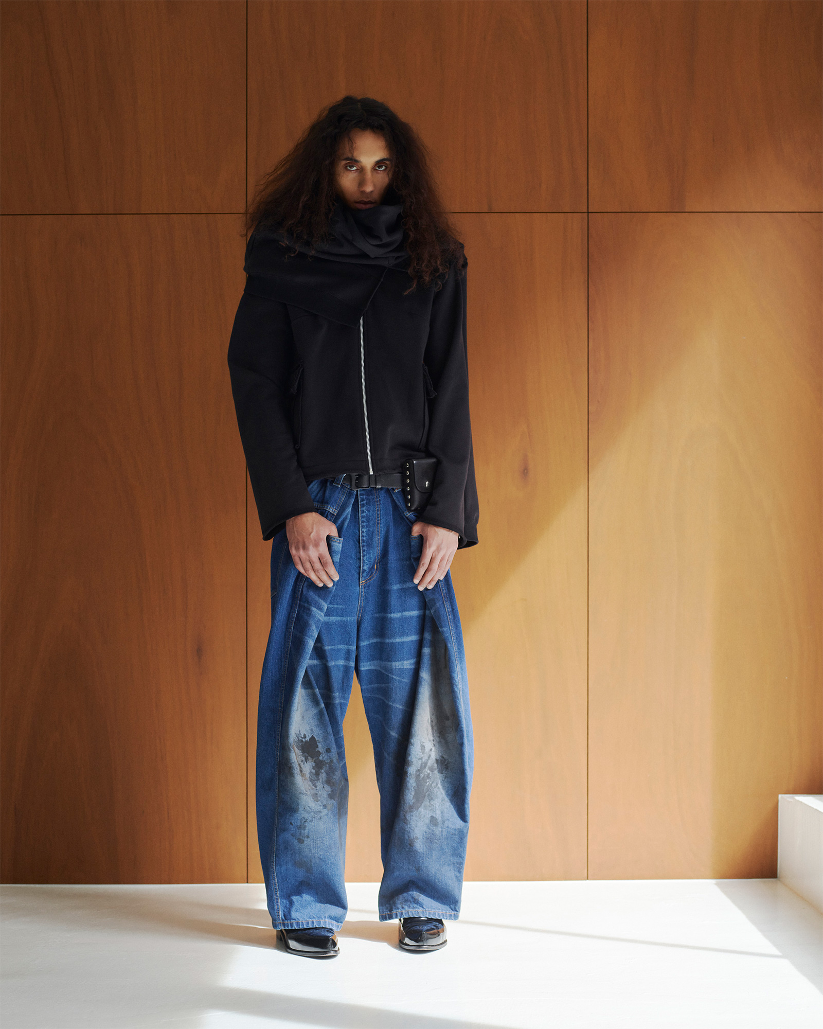 折見:このアイテムは、もともとスタイリストとのセッションの中で生まれたものなんです。初期の頃にスタイリングをお願いしていた初沢大地さんのアイデアから生まれ、それをさらにパクティンが今シーズンの形に発展させてくれました。特にこのビッグデニムに関しては、スタイリストのアイデアを製品化する流れがありますね。