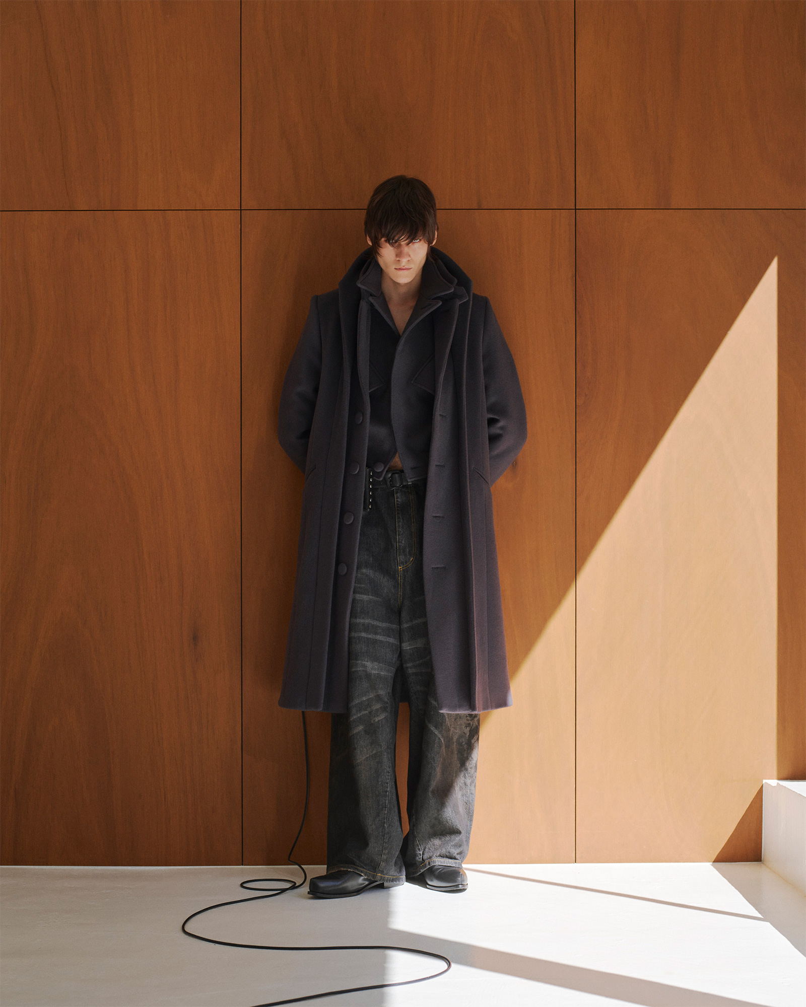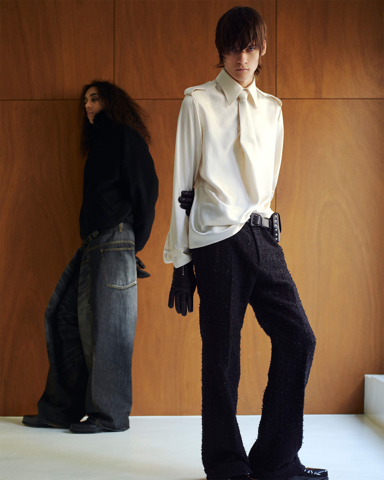 例えば、今シーズンの重要なアイテムであるコート(写真下)。ブラックのこのコートにワイドパンツを合わせればフォーマルでドレッシーな印象になりますが、色違いのほうにはスキニーパンツを合わせて、よりセクシーでロックンロール、そしてメランコリックな雰囲気を演出しました。このように、同じ型のアイテムでも、着方やシルエットを変えればまったく違う物語を紡ぎ出すことができるのです。
