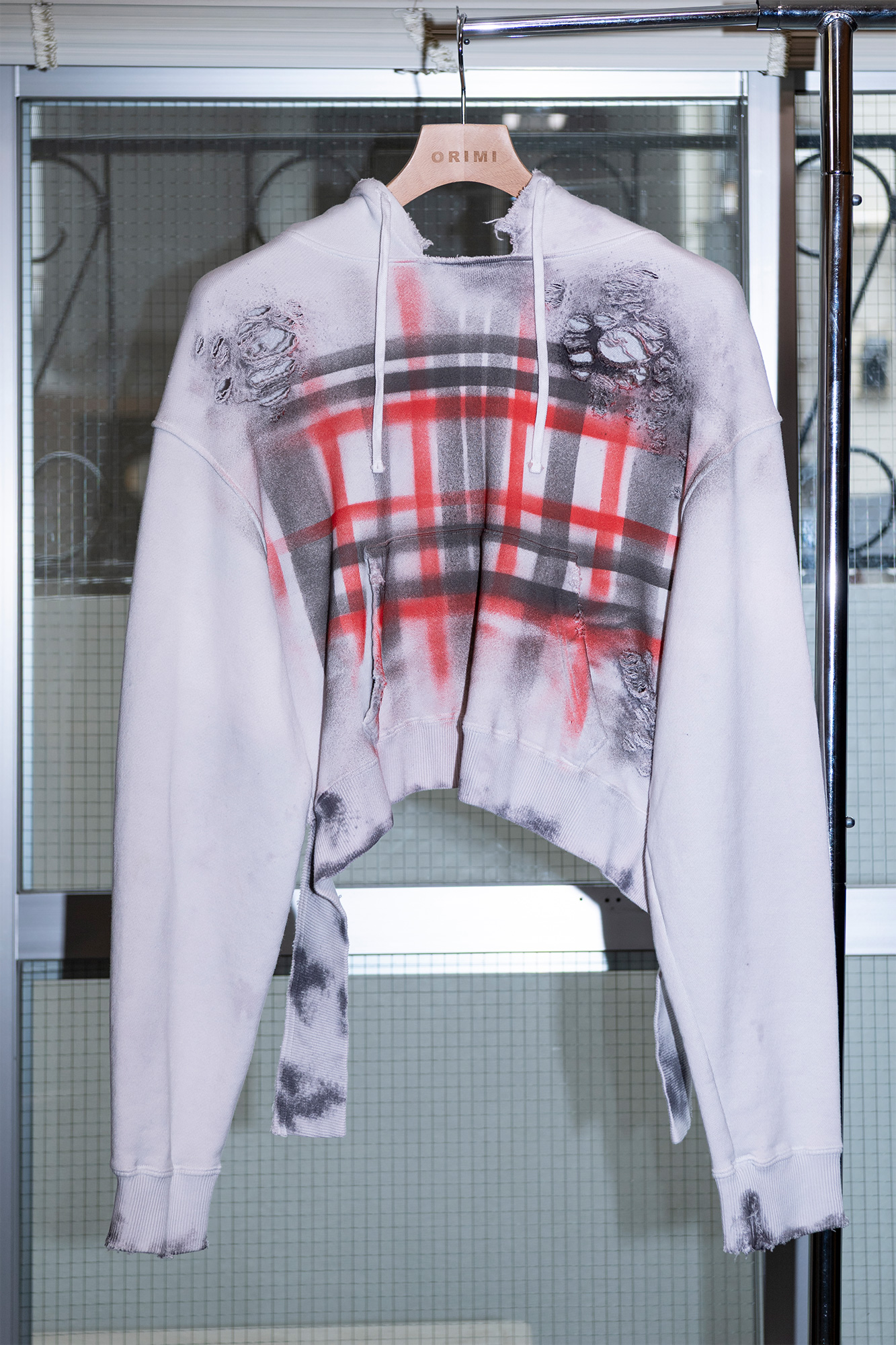 左 スプレーペイントで大胆にチェック柄を描き、職人による手の込んだダメージ加工を前後に施したショート丈フーディ。