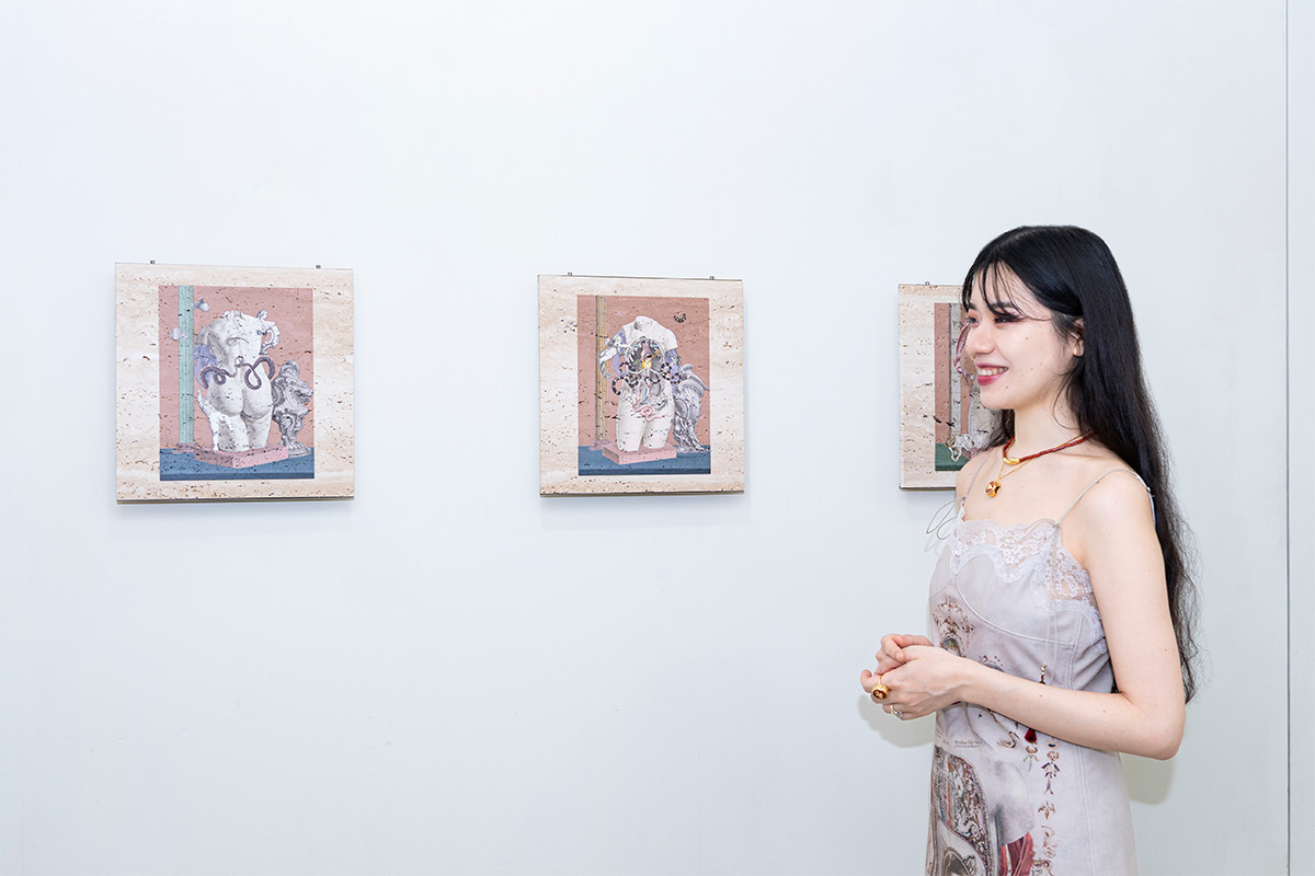 左から“創造”“美”“愛”を象徴する三美神をモチーフにした新作「She, Still Life」の連作について説明するスズキさん。作品に登場する蛇は、創世記のアダムとイヴの物語に連なり、「再生」や「変容」のシンボルであるのと同時に、医療神の象徴でもある。