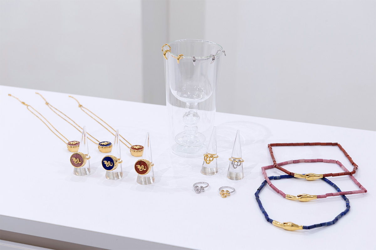ジュエリーは年に1度新作を発表していて、今回で3rdコレクションとなります。タイトルは「Medical Alchemist」(メディカル アルケミスト:医療錬金術師)。平面作品とも関連し、医療のシンボルであるアスクレピオスの杖からインスピレーションを受けた蛇モチーフのジュエリーを展開しています。