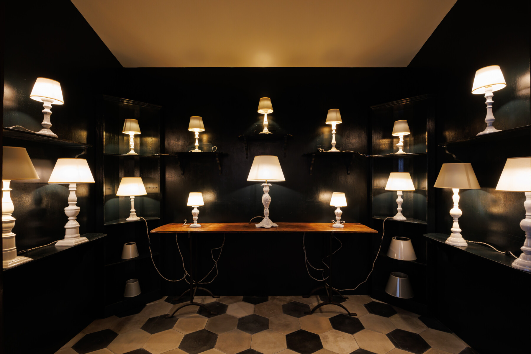 また、店内には大小様々なランプが展示されたアーティスティックな雰囲気が漂う空間も。このスペースには世界各国から届けられたという雑貨類が立ち並び、ドイツで制作された陶器製の注ぎ口キャップからイタリア定番の直火式エスプレッソメーカーまで、数多くの作品を目にすることができる。