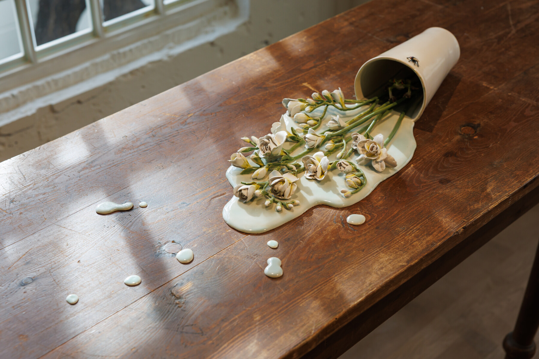 さらに、上層階のアートギャラリーでは現在、彫刻家のセレナ・キャロンヌによる個展が開催中。数あるユニークな作品の中でも、手作業で施したペイントエナメルが特徴の陶器作品や、鍋となだれ落ちるスパゲティを表現した作品、炎で焼き尽くされたハンカチがモチーフの作品など、唯一無二のクリエイティビティが映し出された作品を見ることができる。