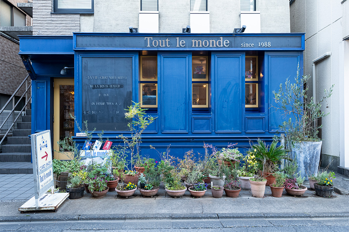 表参道のメインストリートから少し路地に入った場所に、カードショップ「トゥールモンド(Tout le monde)」はあります。まるで外国のショップのような、鮮やかなブルーの外観が目印です。