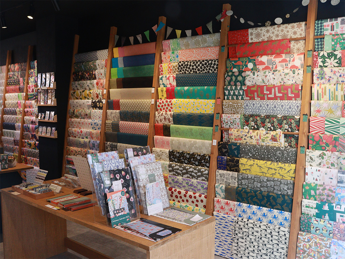 棚に陳列されているのは、A3より少し小さめサイズのペーパー。紙そのものを集めたくなるようなショップオリジナルのデザインが揃い、1シート110円から気軽に購入できるのも魅力。ブックカバーにしたり、コラージュに使ったりと、アイデア次第で楽しみがどんどん広がります。