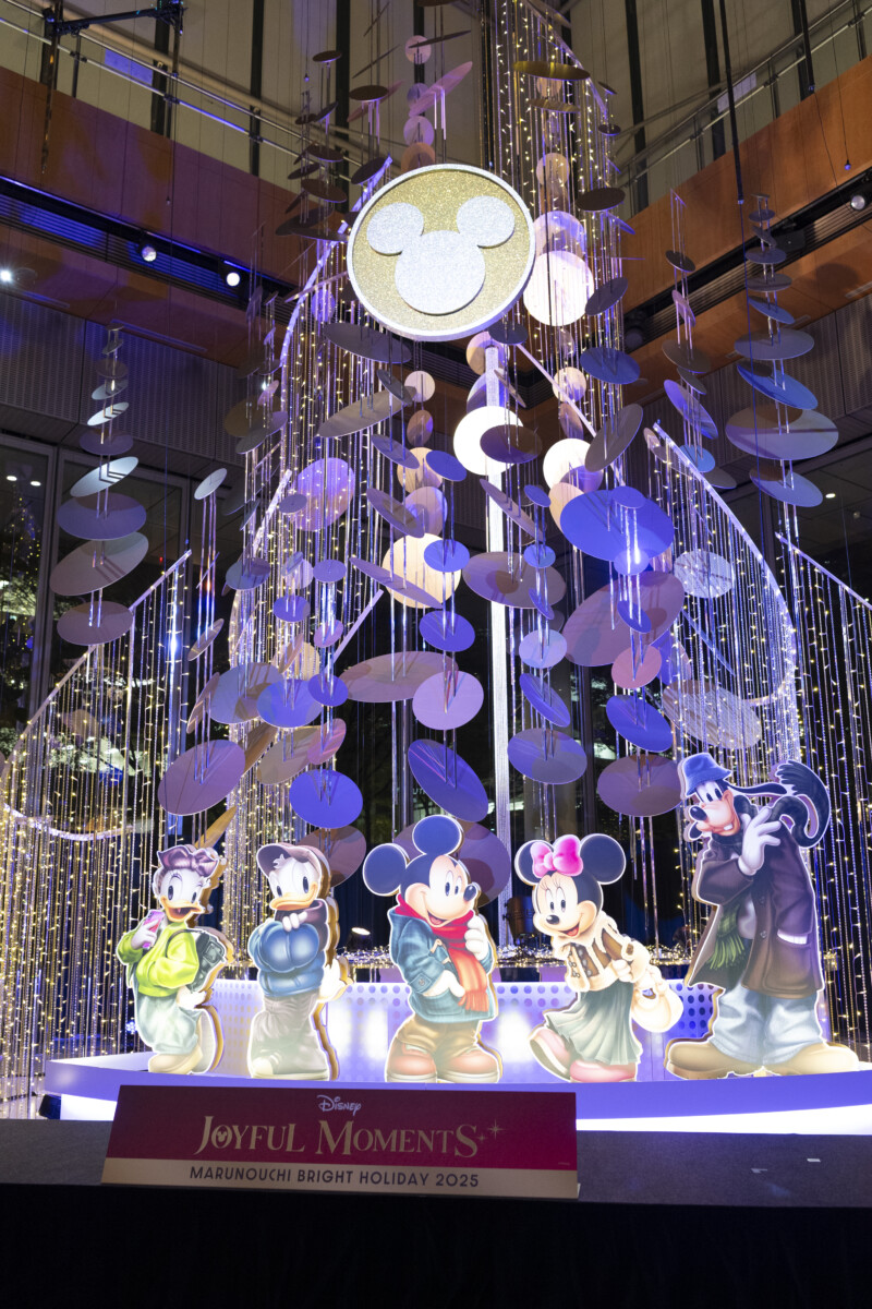 今回、丸ビルに設置されたツリーは、大小さまざまな円形パーツが幾重にも吊り下がり、きらめくライトが光のカーテンのように周囲を包み込むデザイン。上部にはゴールドに輝くミッキーのオブジェが存在感を放ち、足元にはミッキーの仲間たちが冬の装いで並ぶフォトジェニックな仕上がりだ。