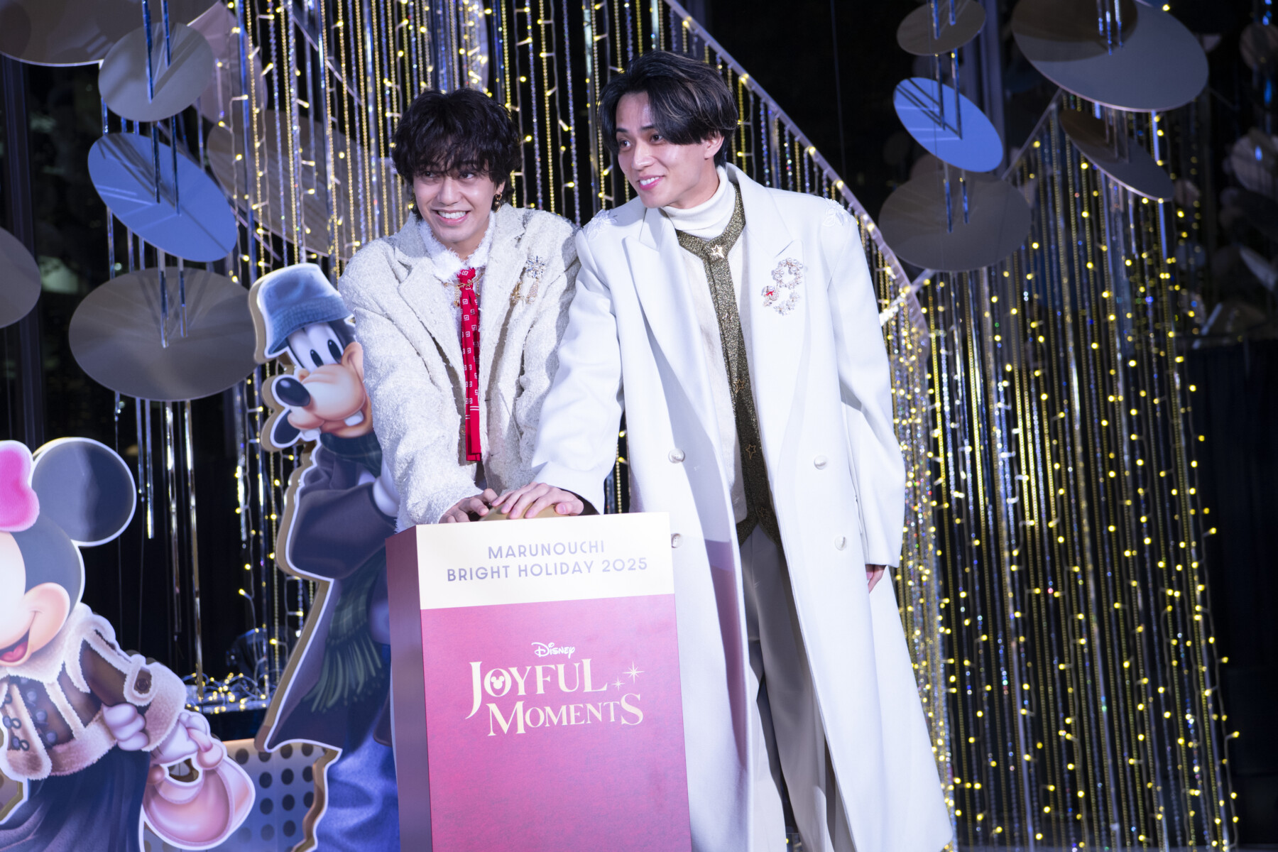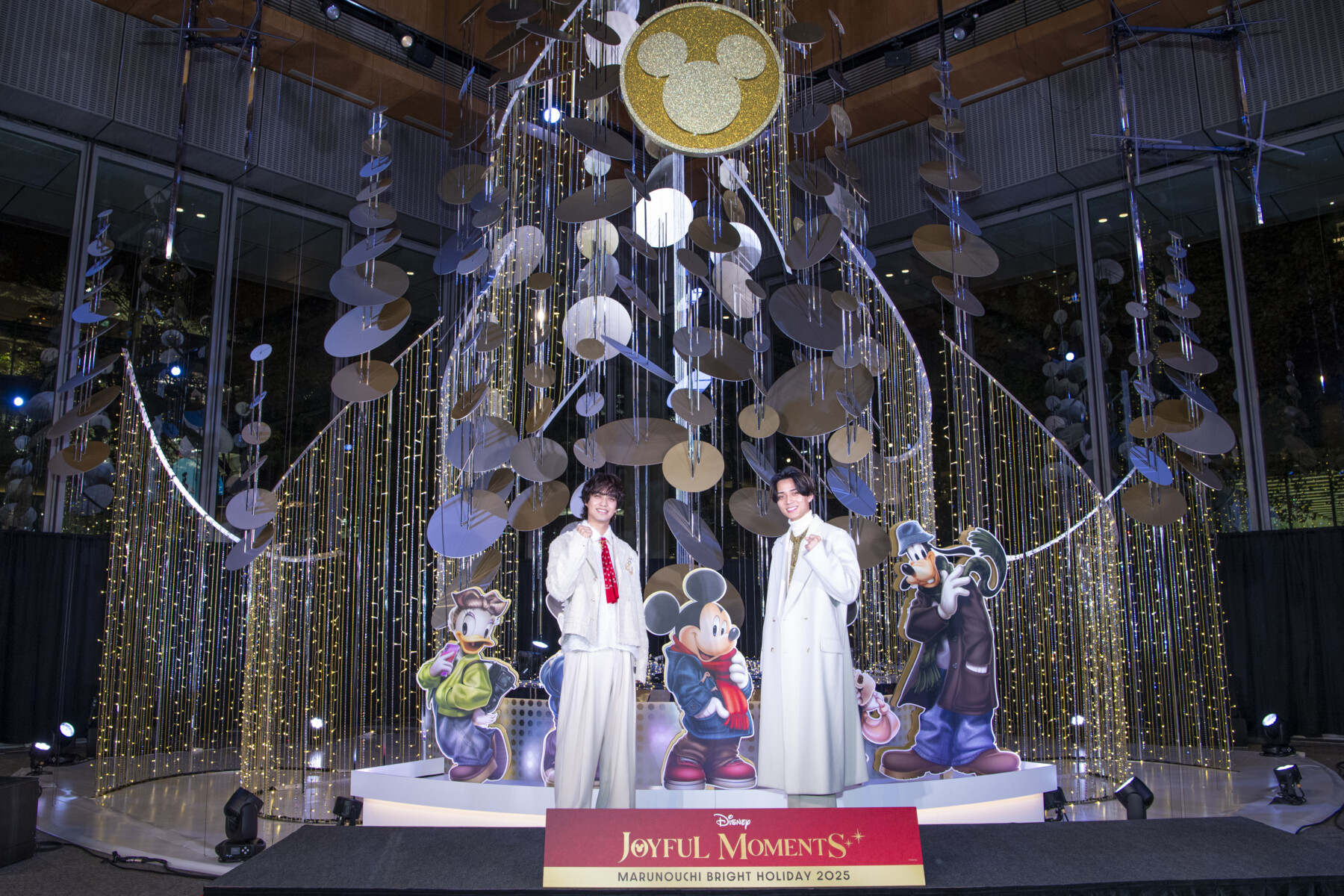 今年で24回目を迎える「丸の内イルミネーション」は、丸の内仲通りを中心におよそ250本の街路樹がシャンパンゴールドの華やかな輝きで彩られる丸の内冬の風物詩。今年は、MARUNOUCHI BRIGHT HOLIDAY 2025「Disney JOYFUL MOMENTS」と題し、ディズニー作品をテーマにしたモニュメントがエリア内の6か所に設置される。初日の11月13日(木)に、丸ビルで行われた点灯式には、ミッキーのベストフレンドであるKing & Princeが登場し、会場を盛り上げた。
