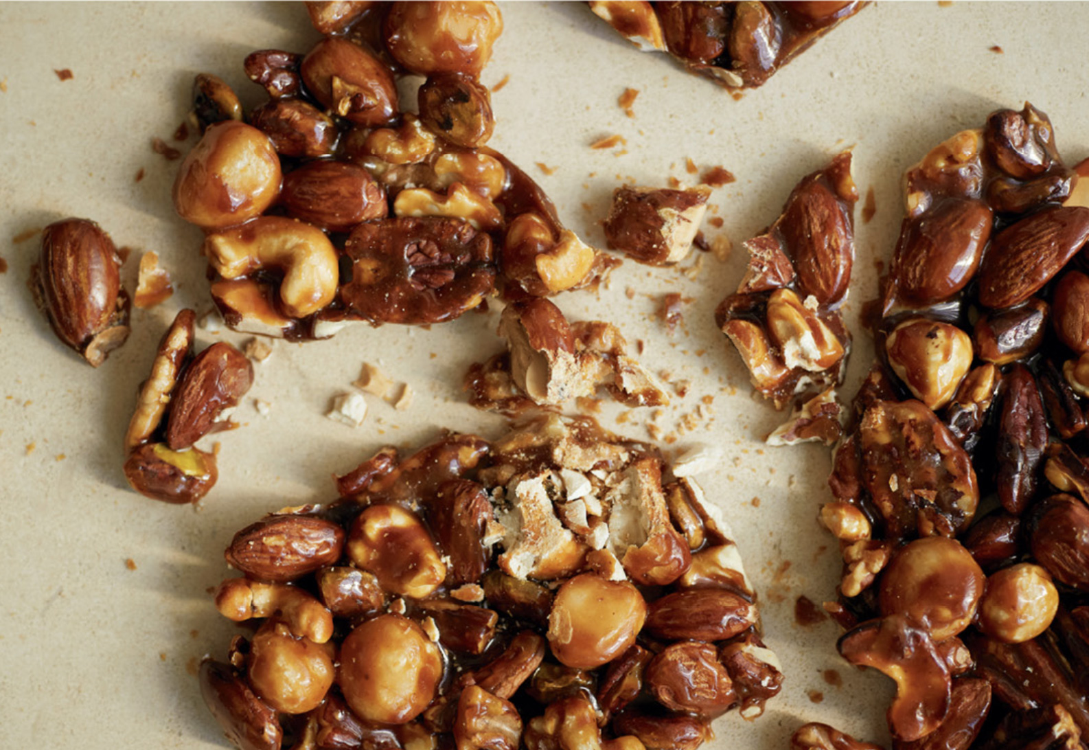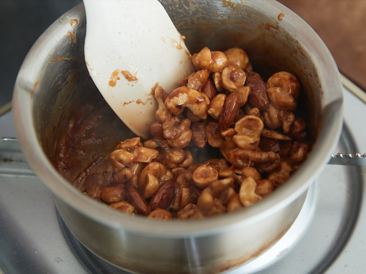 香ばしくローストしたナッツにキャラメルを絡めたシンプルで手軽なおやつ。ナッツは好みのものを使用してもいいし、あらかじめ数種類のナッツがブレンドされたミックスナッツローストを使うと便利です。