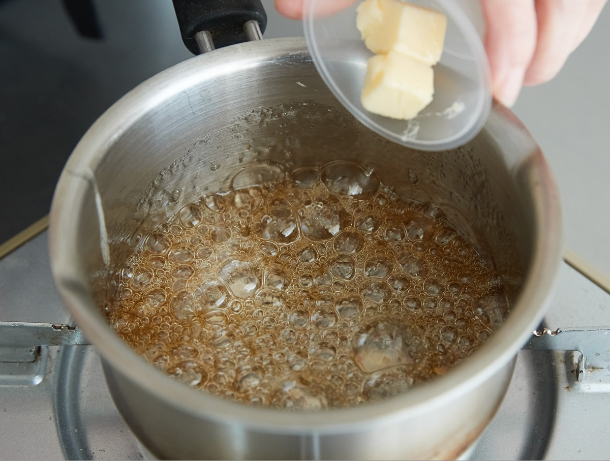 2 淡いキャラメル色がついたらバターを加えa、ゴムべらで混ぜる。
