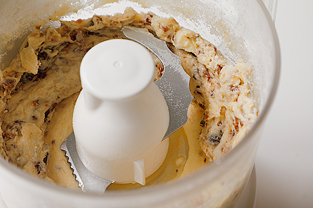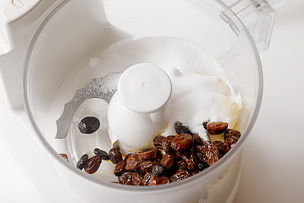 1 フードプロセッサーにAを入れ(b)、グラニュー糖がバターになじんで見えなくなるまで混ぜ合わせる(c)。