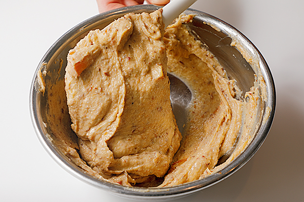 2 Bを2~3回に分けて加え、その都度混ぜ合わせる。マヨネーズのようにとろりとなったらゴムべらでまとめる。