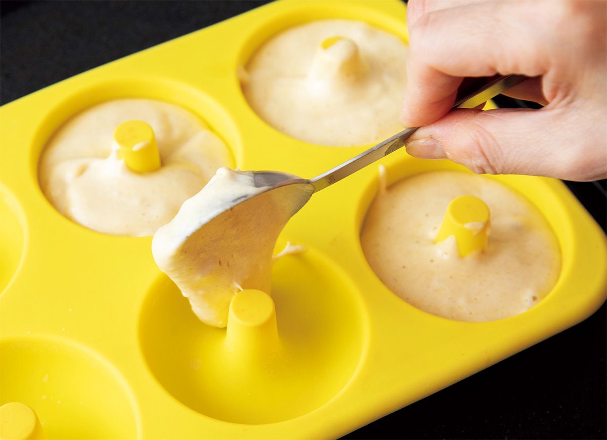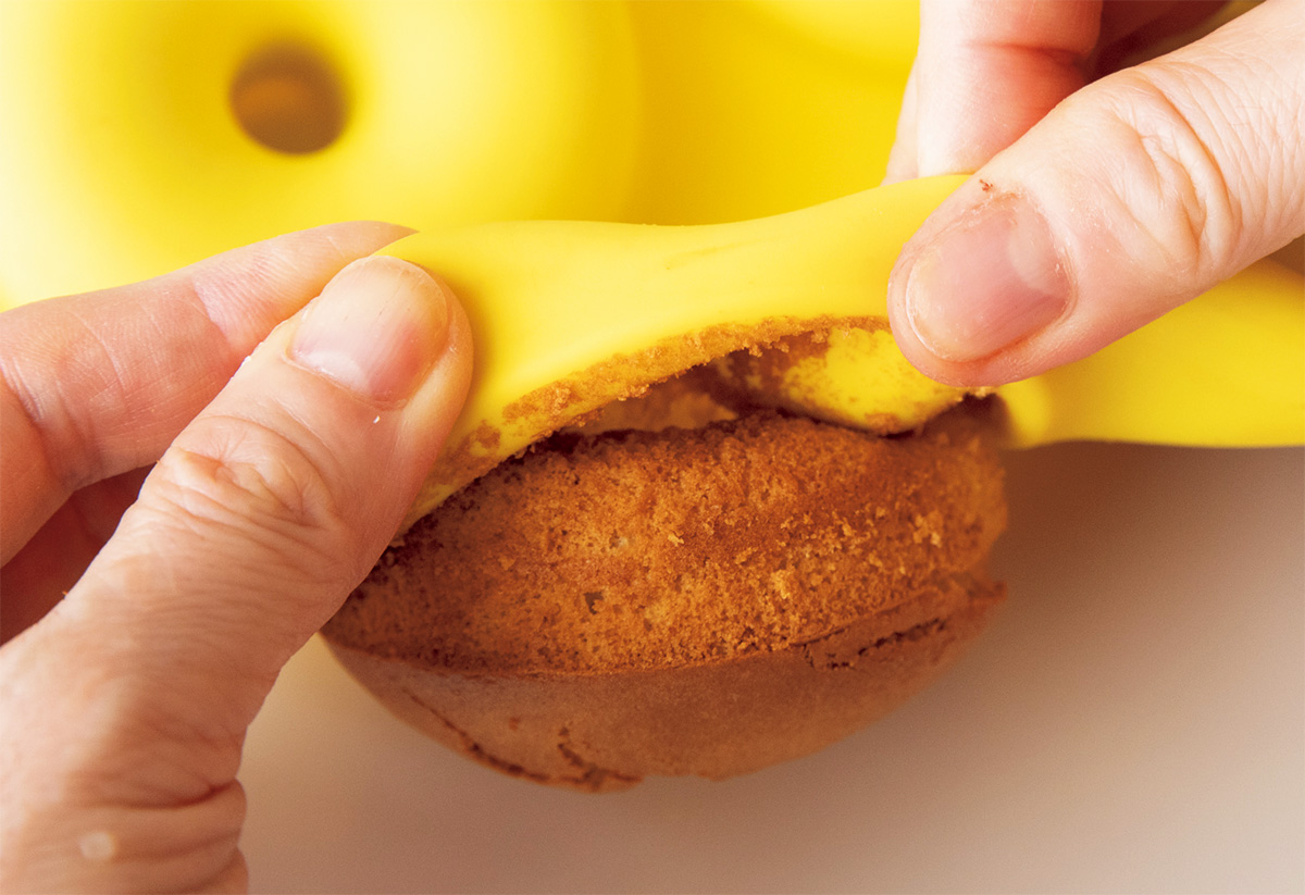 シリコン型は油などをぬる必要がないので便利。焼き上がったらそのまま冷まし、逆さにして、型からはがすようにやさしくはずす。