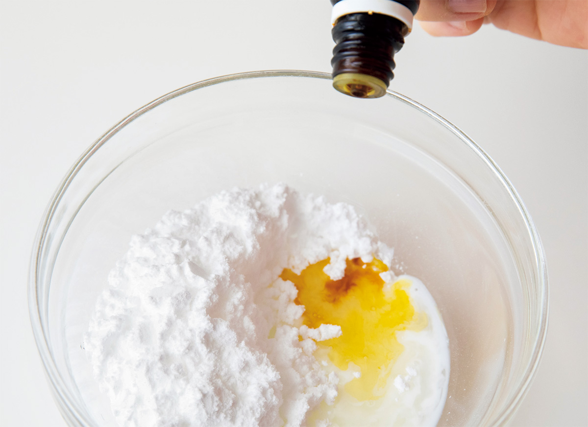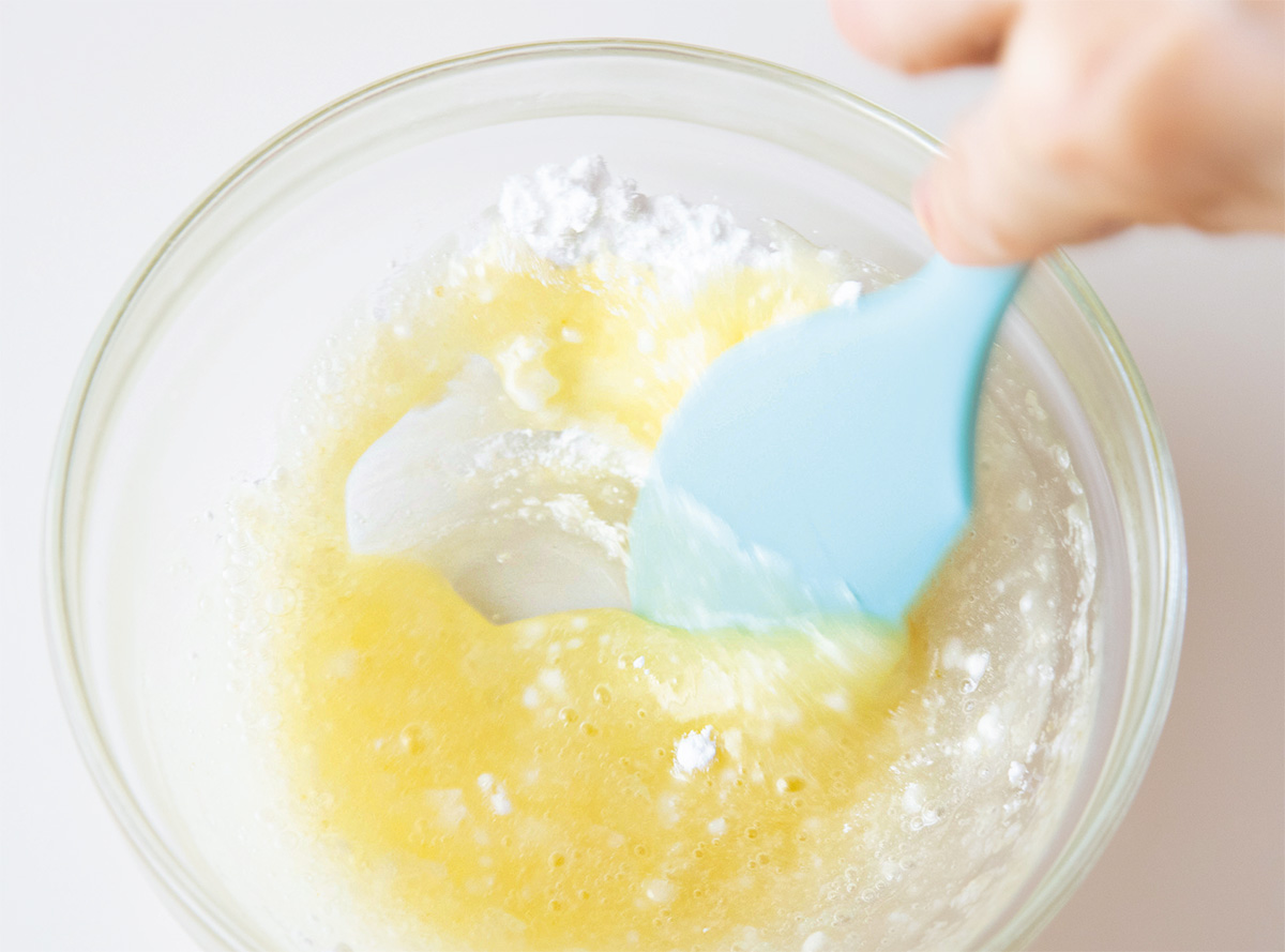 2 別のボウルに卵黄、砂糖25g、A を入れ、ハンドミキサー(低速)で、砂糖が溶けてなめらかな状態になるまで混ぜる。
