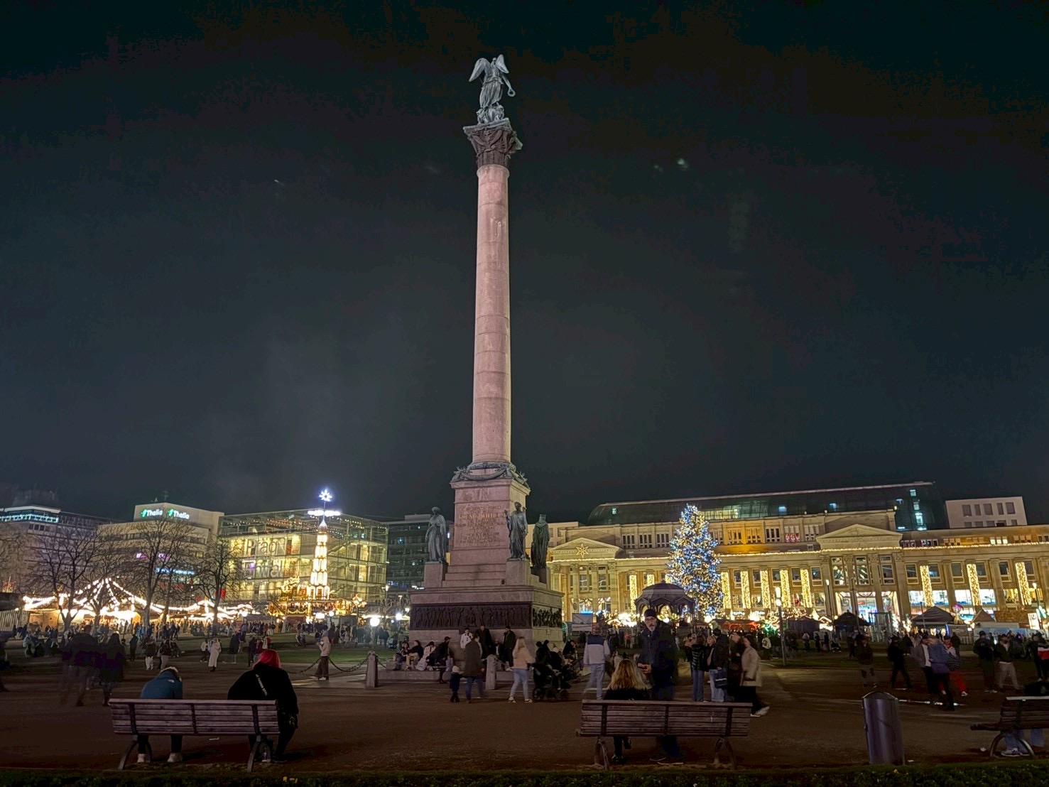 広場の中央に立つ大きなモミの木が圧巻