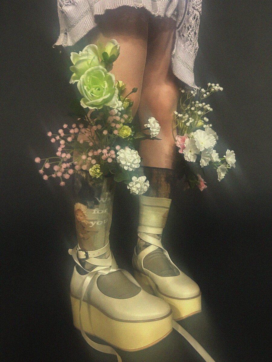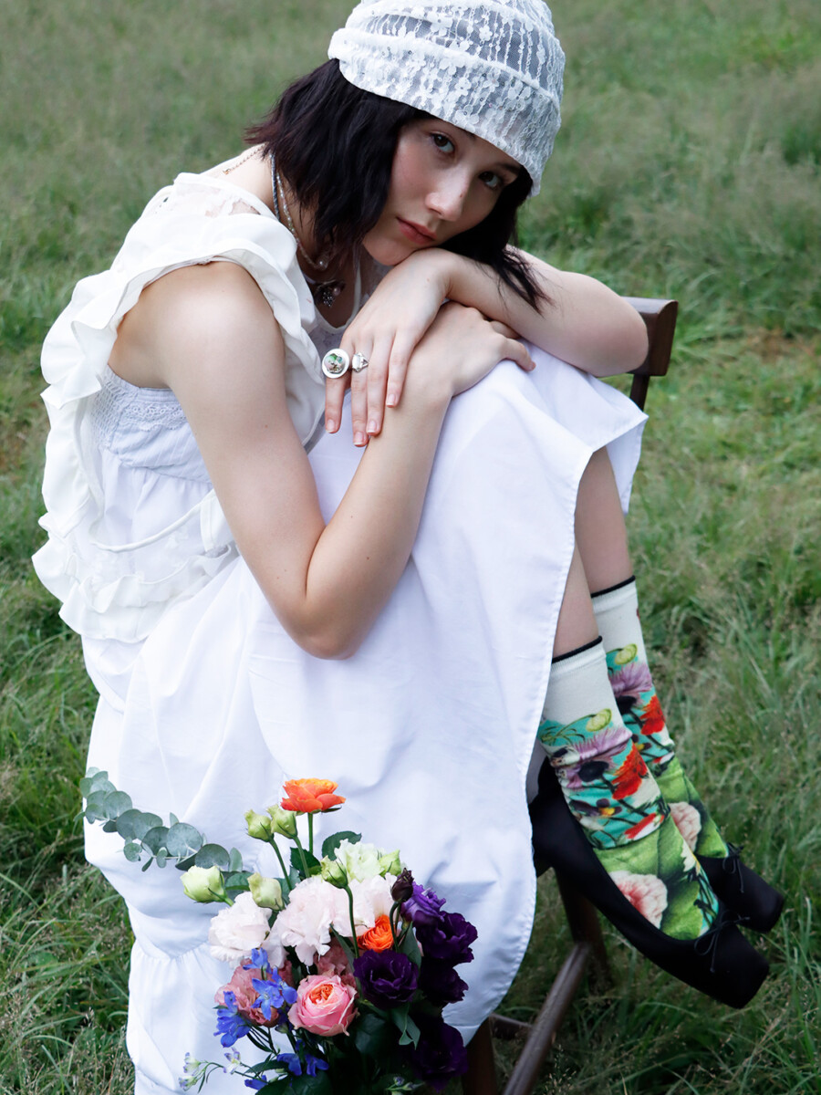 グラフィックデザイナーのアルフォンス・ミュシャの描いた「四つの花」の世界観をテーマに、水と花のモチーフを靴下に取り入れた。