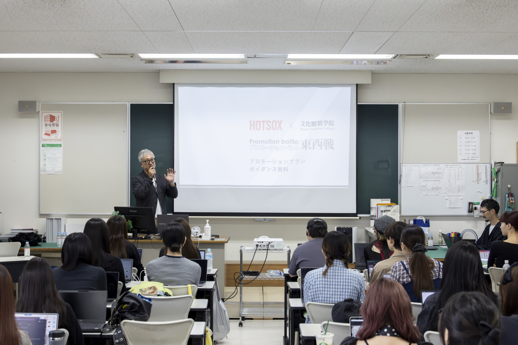 文化服装学院でのキックオフミーティングの様子。HOTSOXについて、高橋良太社長からレクチャーを受ける学生たち。