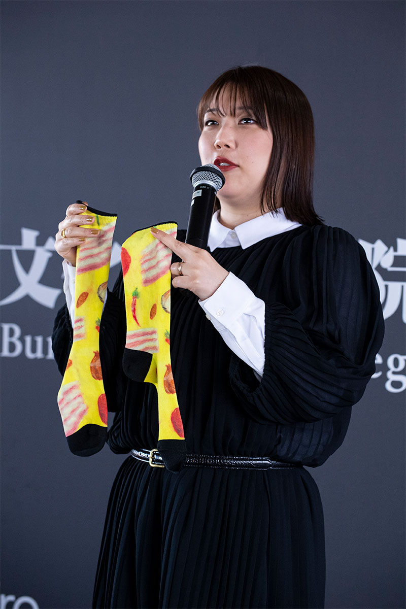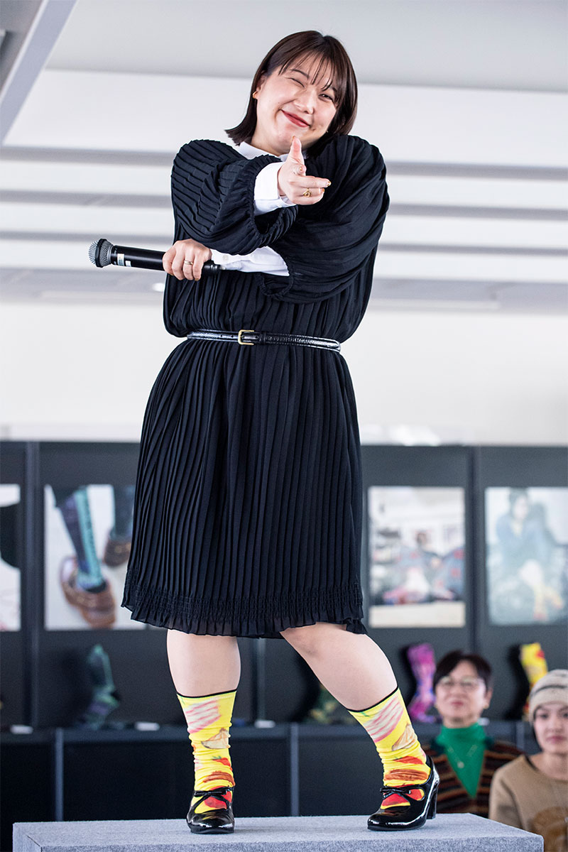 記者発表での山井祥子さん。モノトーンを基調としたコーディネートに、ソックスの鮮やかなイエローと食材モチーフのグラフィックが映える。キュートな決めポーズも!photographs : Jun Tsuchiya (B.P.B.)