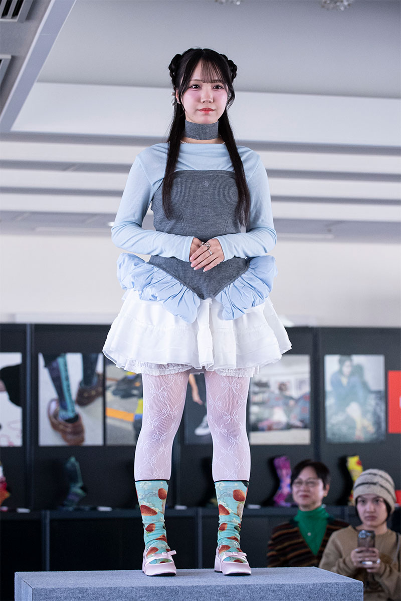 学生たちは、オリジナルソックスをそれぞれが選定したモデルにスタイリングして記者発表で披露した。