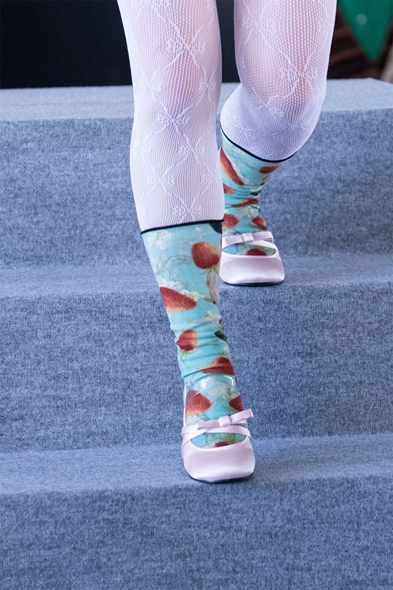 足元から始まる春のファンタジーをテーマに、咲き誇る花々とふわりと漂う苺を描きだした。履くたびに心が軽やかになるような感覚をもたらしてくれる。