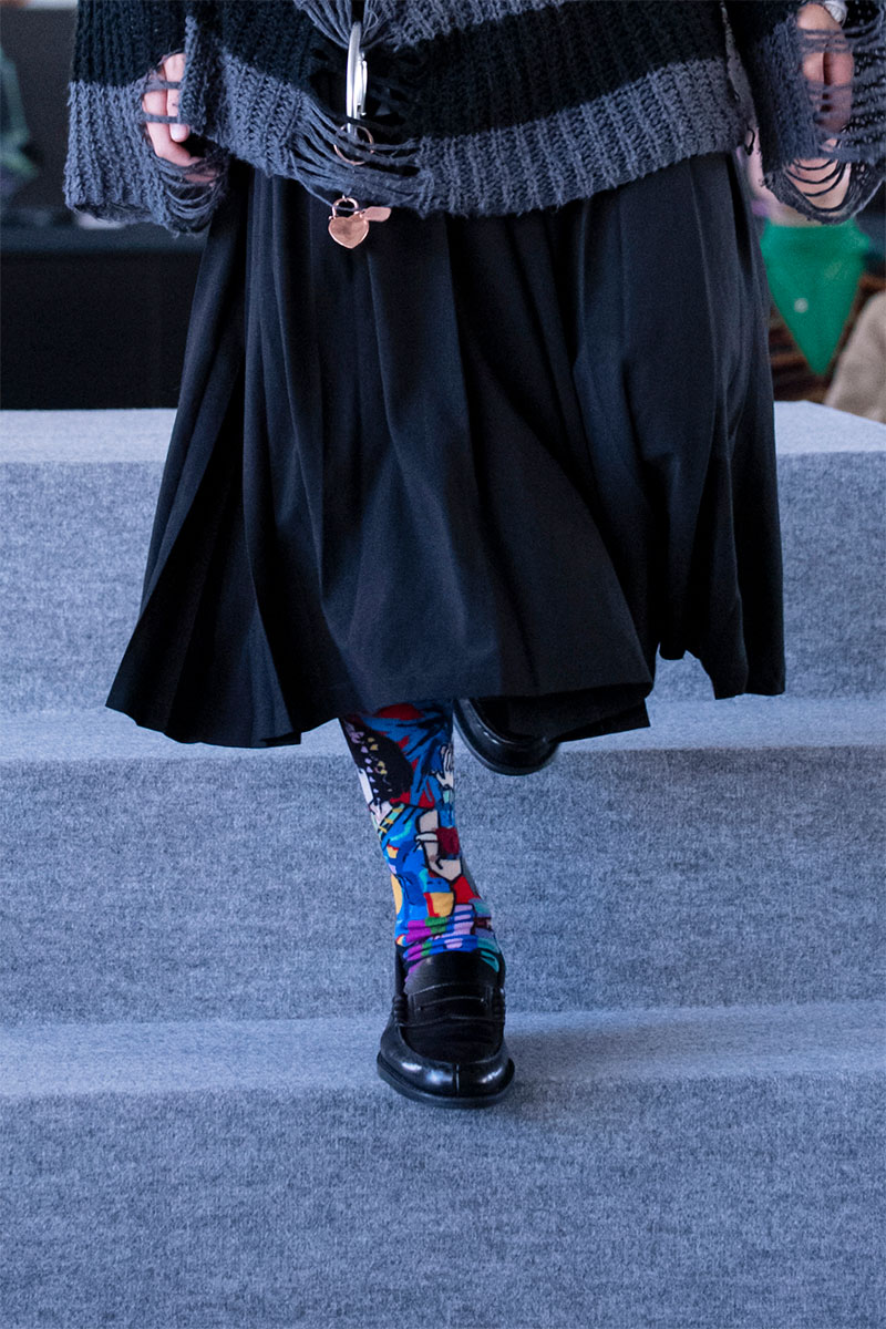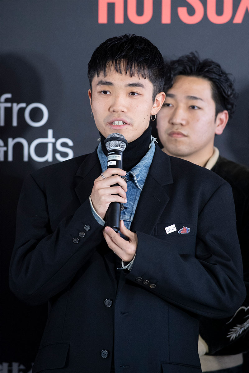 記者発表での京極風斗さん。柄のパンツにオリジナルソックスを合わせたおしゃれな着こなしで登場した。photographs : Jun Tsuchiya (B.P.B.)