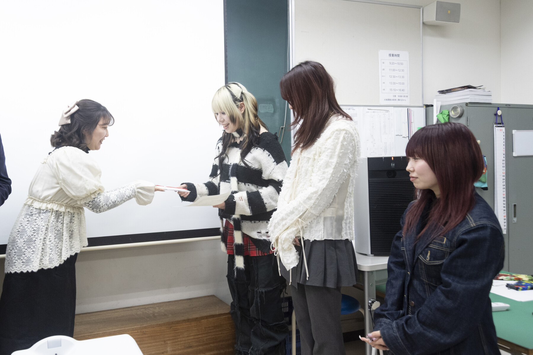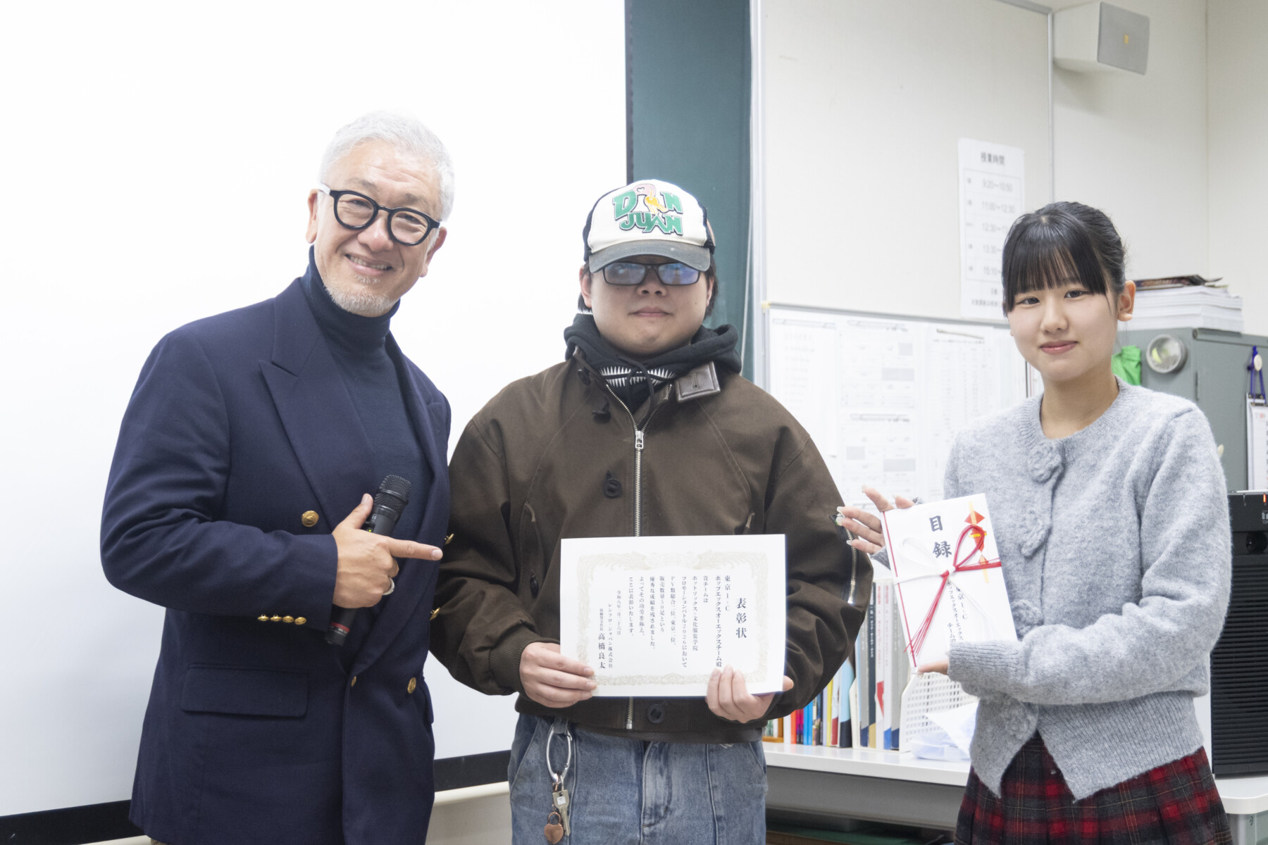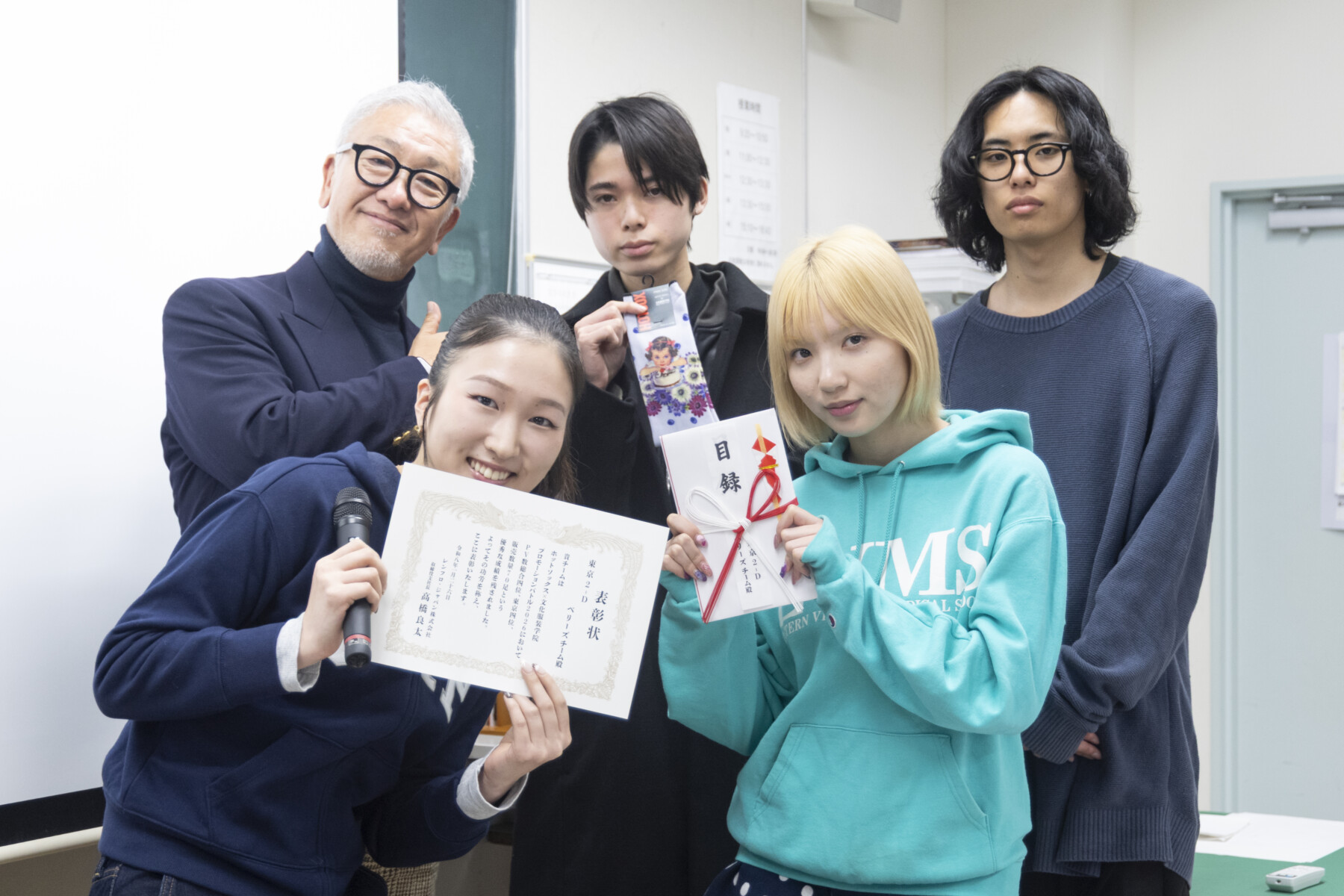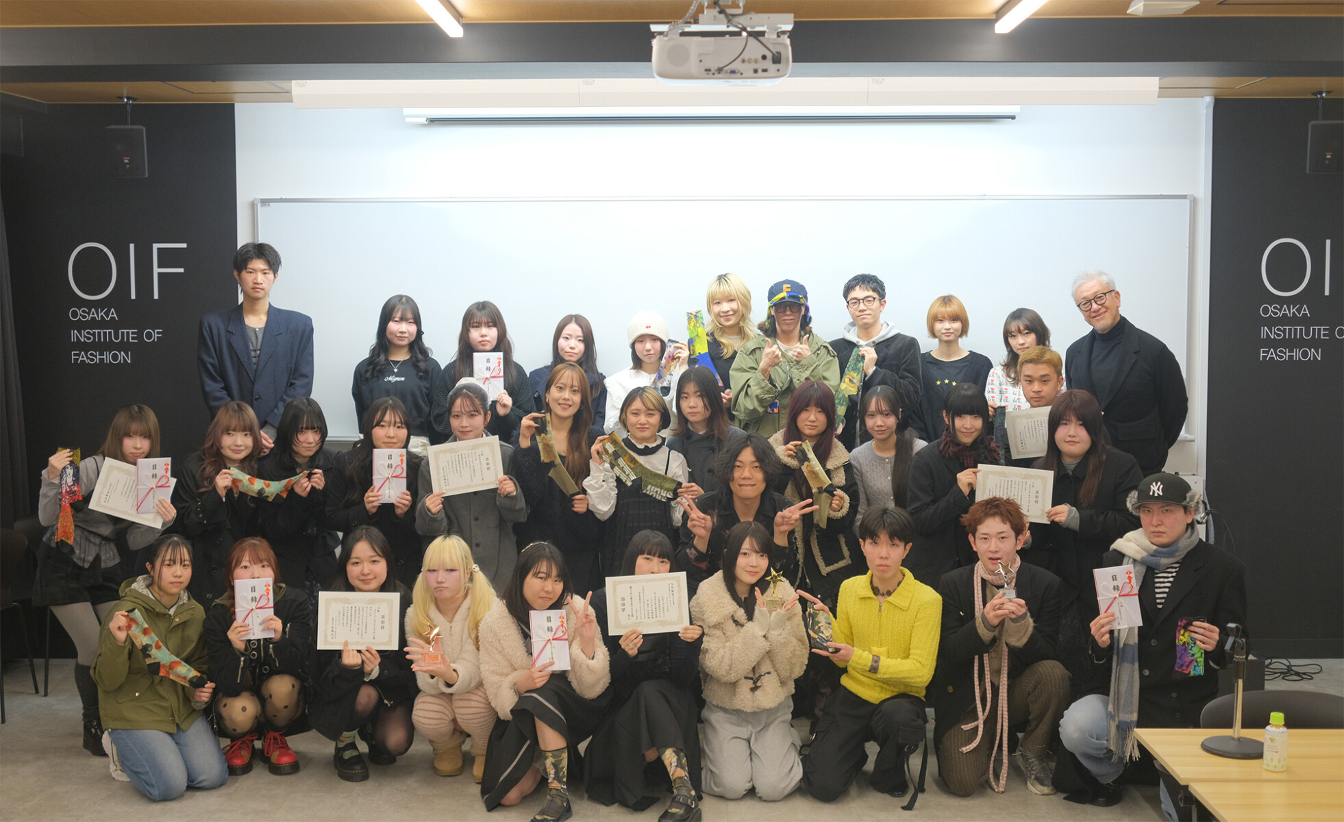そしてついに2026年1月下旬、両校でその結果発表と授賞式が開催。文化服装学院には東京チームのアンバサダーを務めたお笑いコンビ、エレガント人生の山井祥子さんが、OIFには大阪チームのアンバサダーである9番街レトロの京極風斗さんがそれぞれ駆けつけ、プロモーションの成果が発表された。