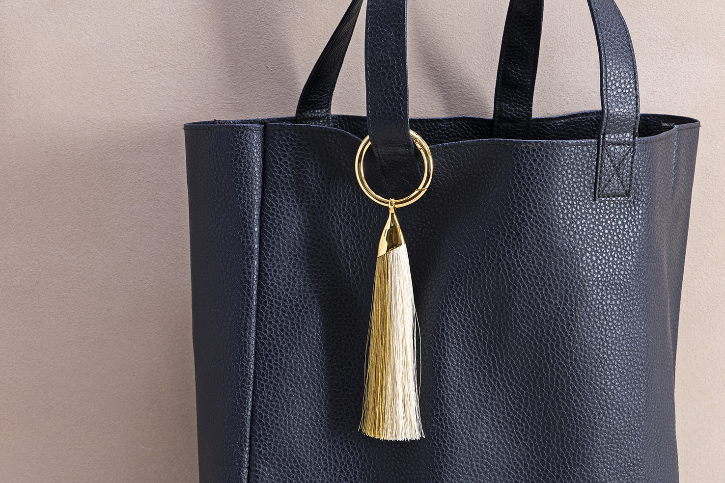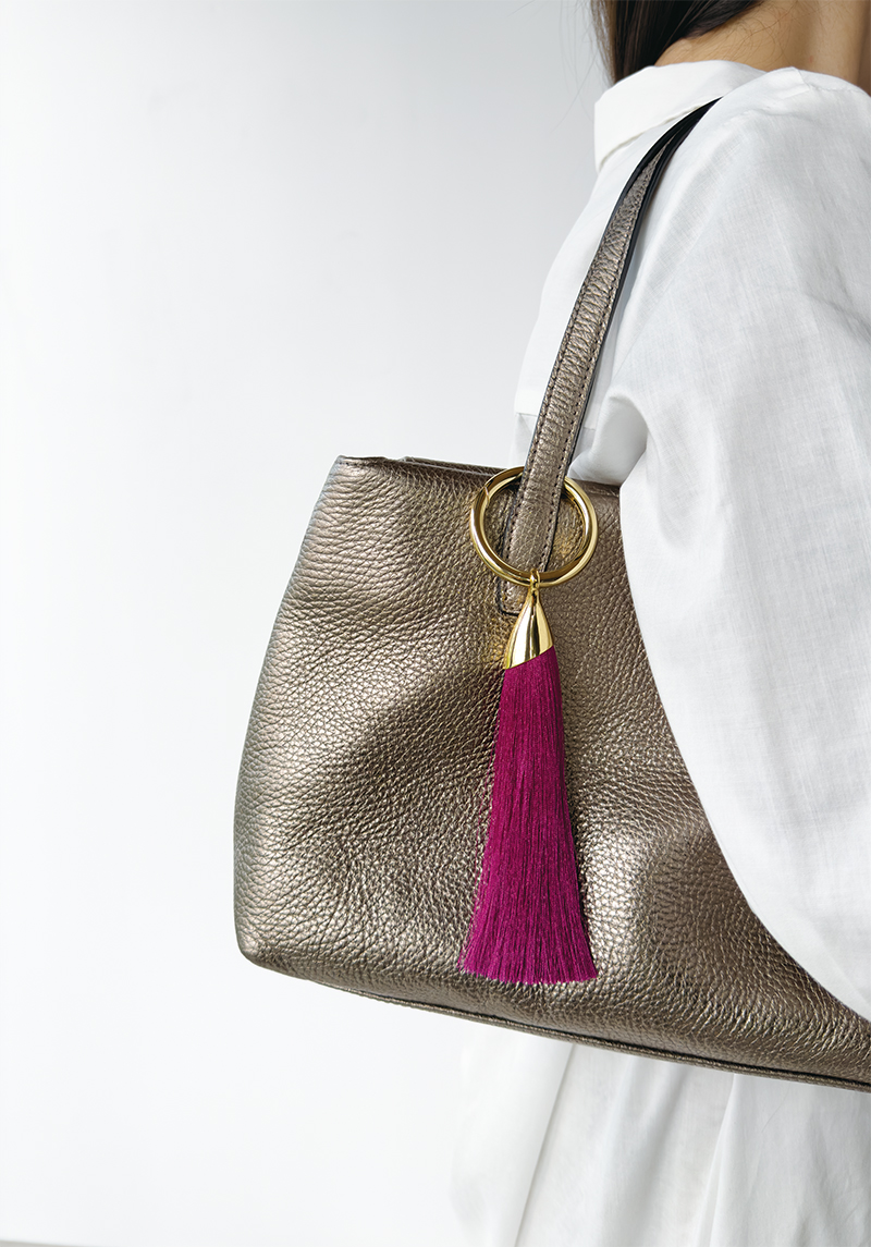 今回発売されるタッセルバッグチャームは、上品な輝きを放つオリジナルの金具と鮮やかなカラーリングが目を引く一点。金具はゴールドとシルバーの2種類で、和にも洋にもマッチするような各12色がラインナップ。艶やかな光沢としなやかな質感で、どんなシーンにも合う洗練された雰囲気をもたらしてくれる。