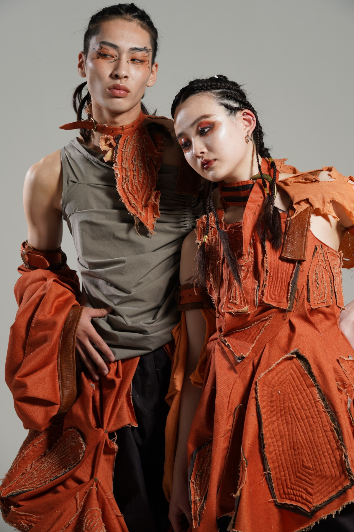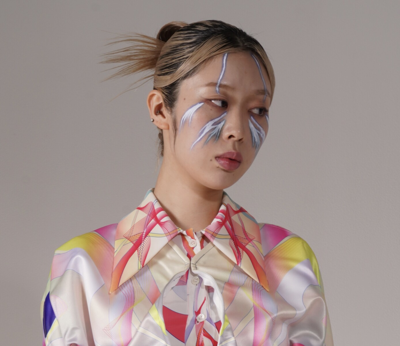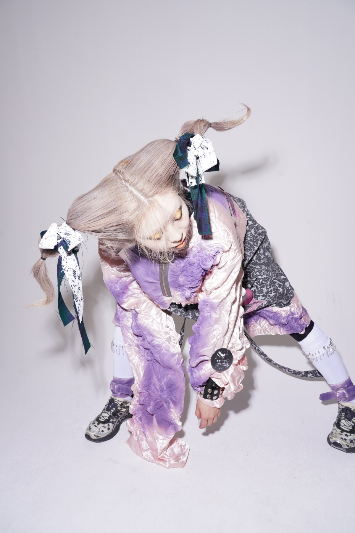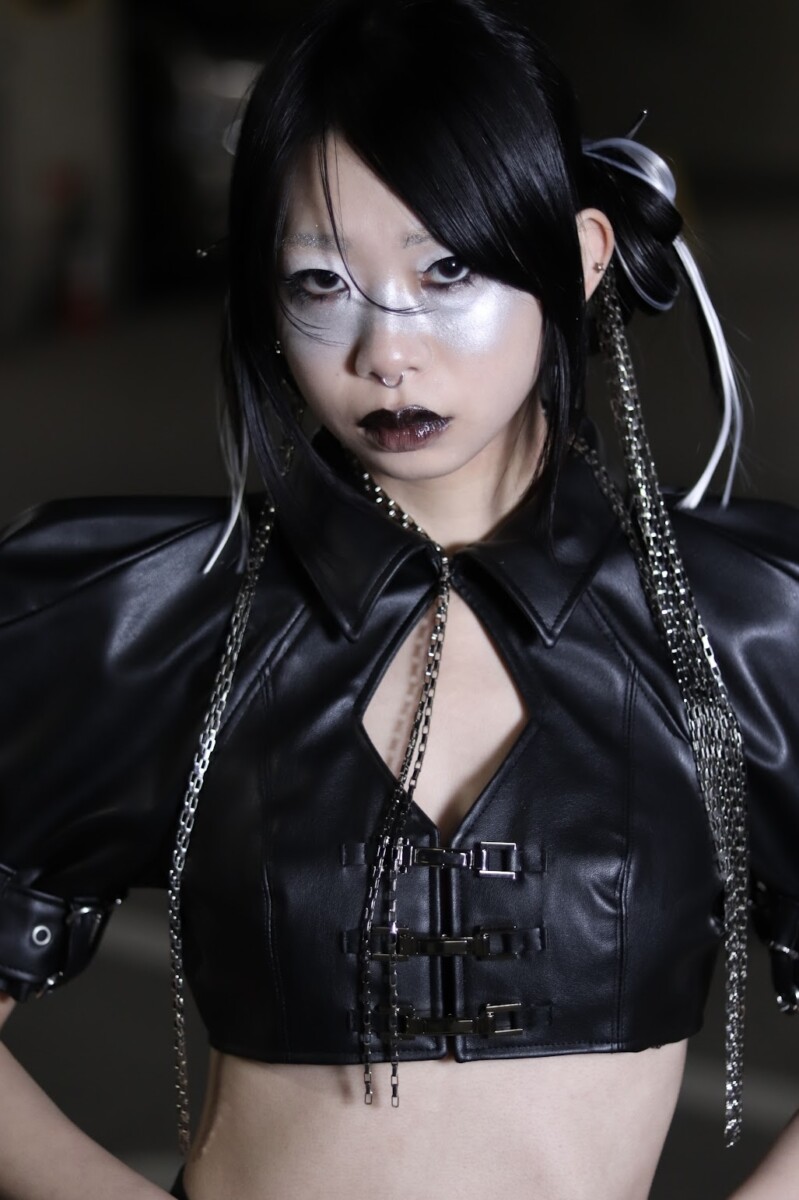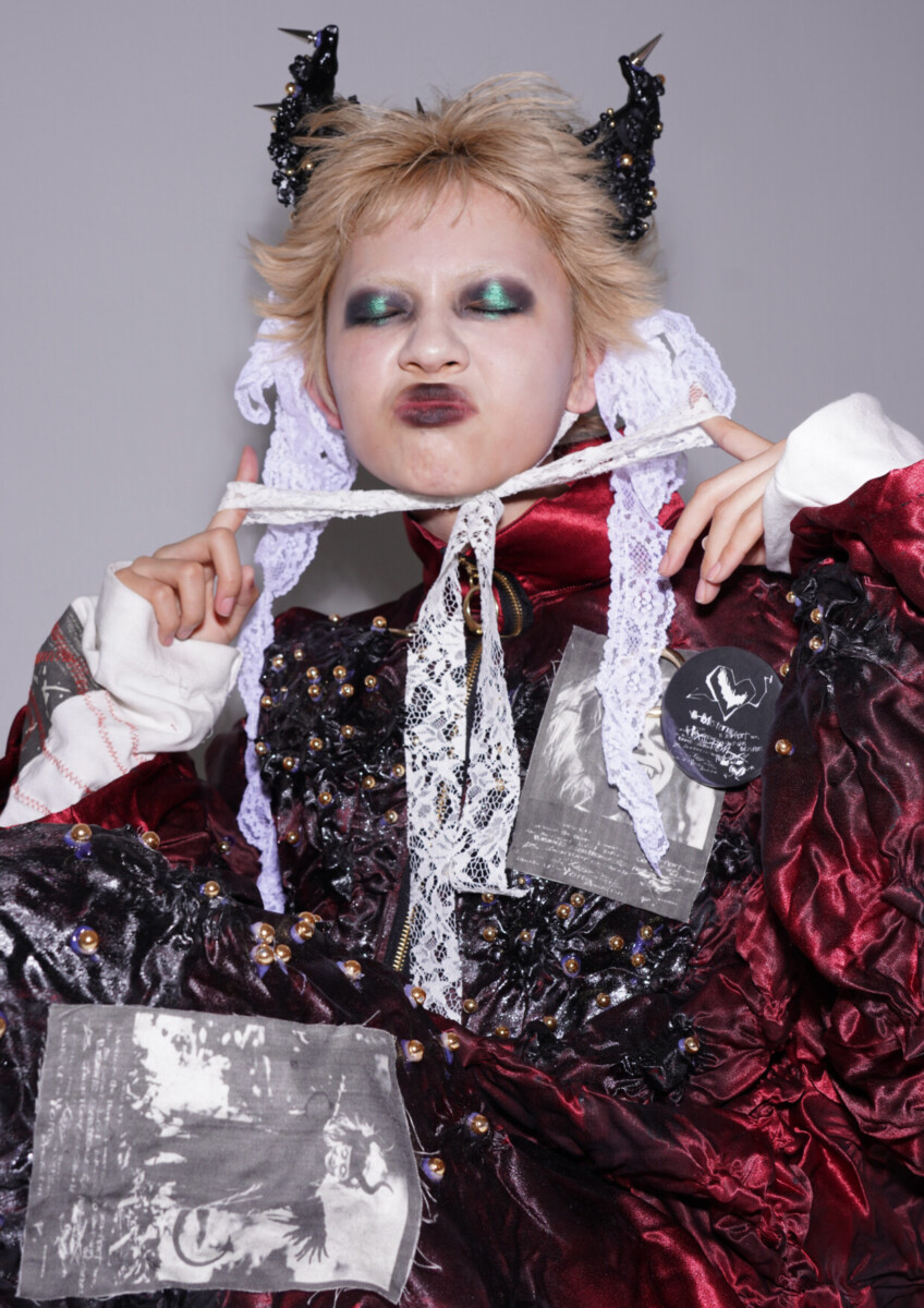 好きなものを素直に表現、感情も隠さないというテーマで制作をしました。シルエットやディテールにトゲトゲした質感を取り入れて、感情や思いが内面から外に飛び出ている雰囲気を表現しています。また、“肌”のようなテキスタイルにこだわり、シリコンなどを用いて素材から制作しました。また、幼い頃はロリータファッションが大好きで、ツインテールばかりしていたのでシルエットはロリータファッションを参考にしています。レディース全7体はツインテールかツインアレンジにしているのもポイントです。メイクは幼い頃から影響を受けてきた海外のビューティー表現や、特殊メイクの要素を反映し、ロレアルさんの協力によって理想のビジュアルになりました。音効では、2年生の頃から絶対に弟にギターを生演奏してもらおうと思っていたので、実現出来てとっても嬉しかったです!これからも物作りを続けて、好きなアーティストにいっぱい着てもらいたいですし、海外でも何か経験を積みたいなと考えています。【Instagram:@a.iiiirrr___】
