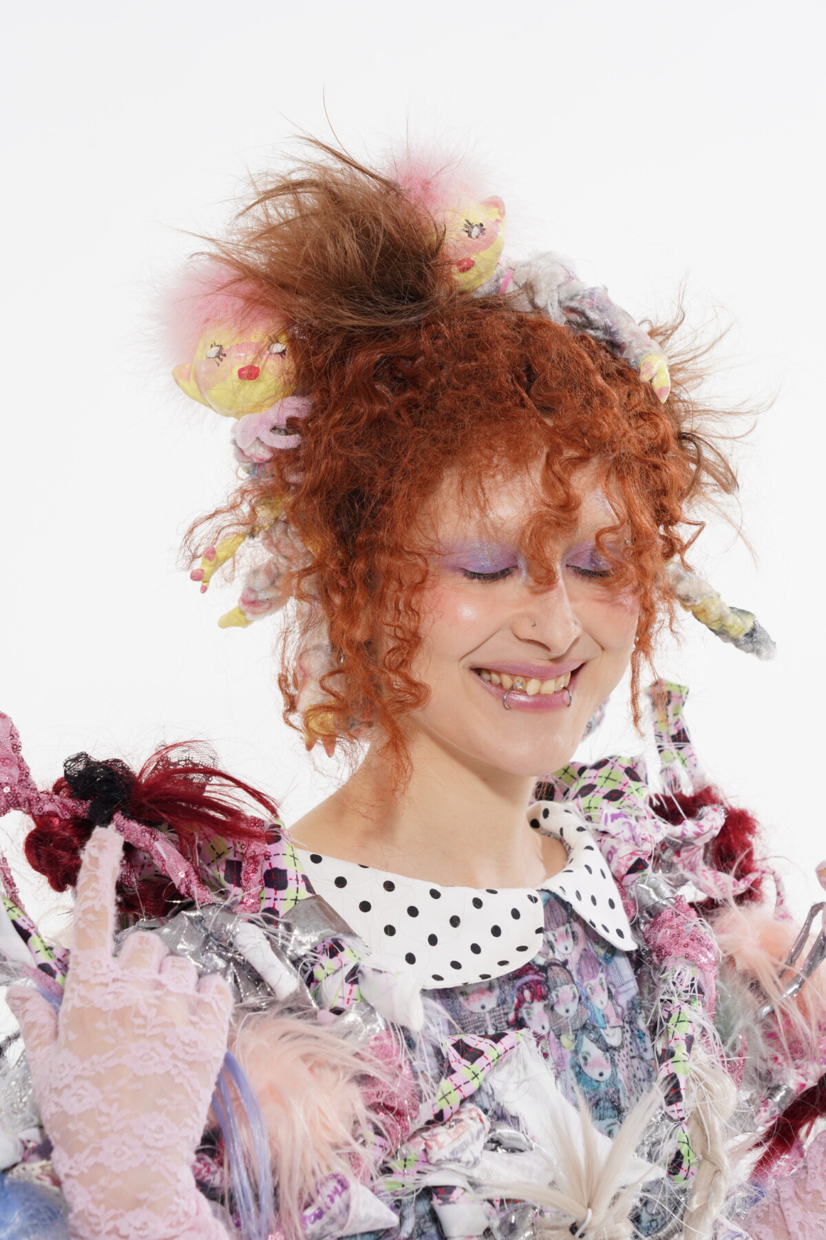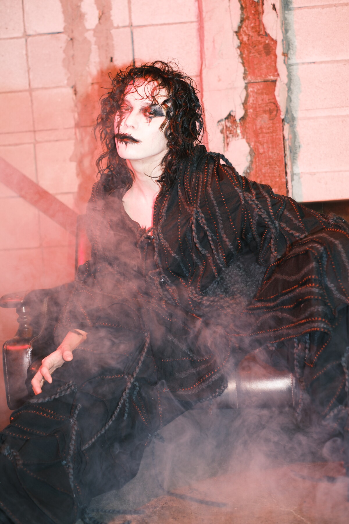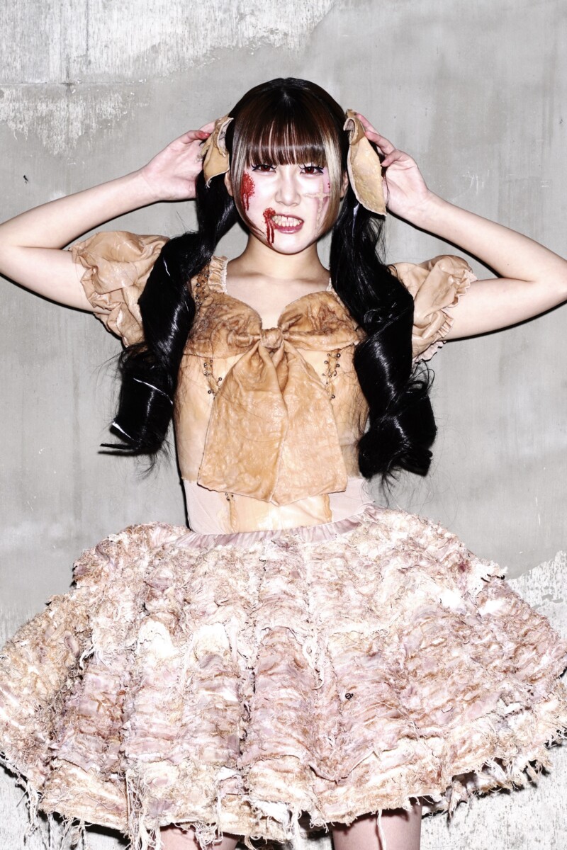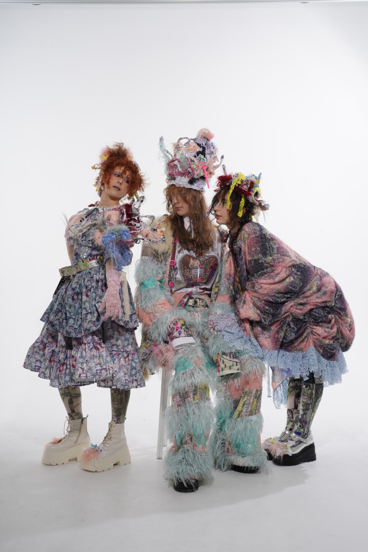 好きなものを素直に表現、感情も隠さないというテーマで制作をしました。シルエットやディテールにトゲトゲした質感を取り入れて、感情や思いが内面から外に飛び出ている雰囲気を表現しています。また、“肌”のようなテキスタイルにこだわり、シリコンなどを用いて素材から制作しました。また、幼い頃はロリータファッションが大好きで、ツインテールばかりしていたのでシルエットはロリータファッションを参考にしています。レディース全7体はツインテールかツインアレンジにしているのもポイントです。メイクは幼い頃から影響を受けてきた海外のビューティー表現や、特殊メイクの要素を反映し、ロレアルさんの協力によって理想のビジュアルになりました。音効では、2年生の頃から絶対に弟にギターを生演奏してもらおうと思っていたので、実現出来てとっても嬉しかったです!これからも物作りを続けて、好きなアーティストにいっぱい着てもらいたいですし、海外でも何か経験を積みたいなと考えています。【Instagram:@a.iiiirrr___】