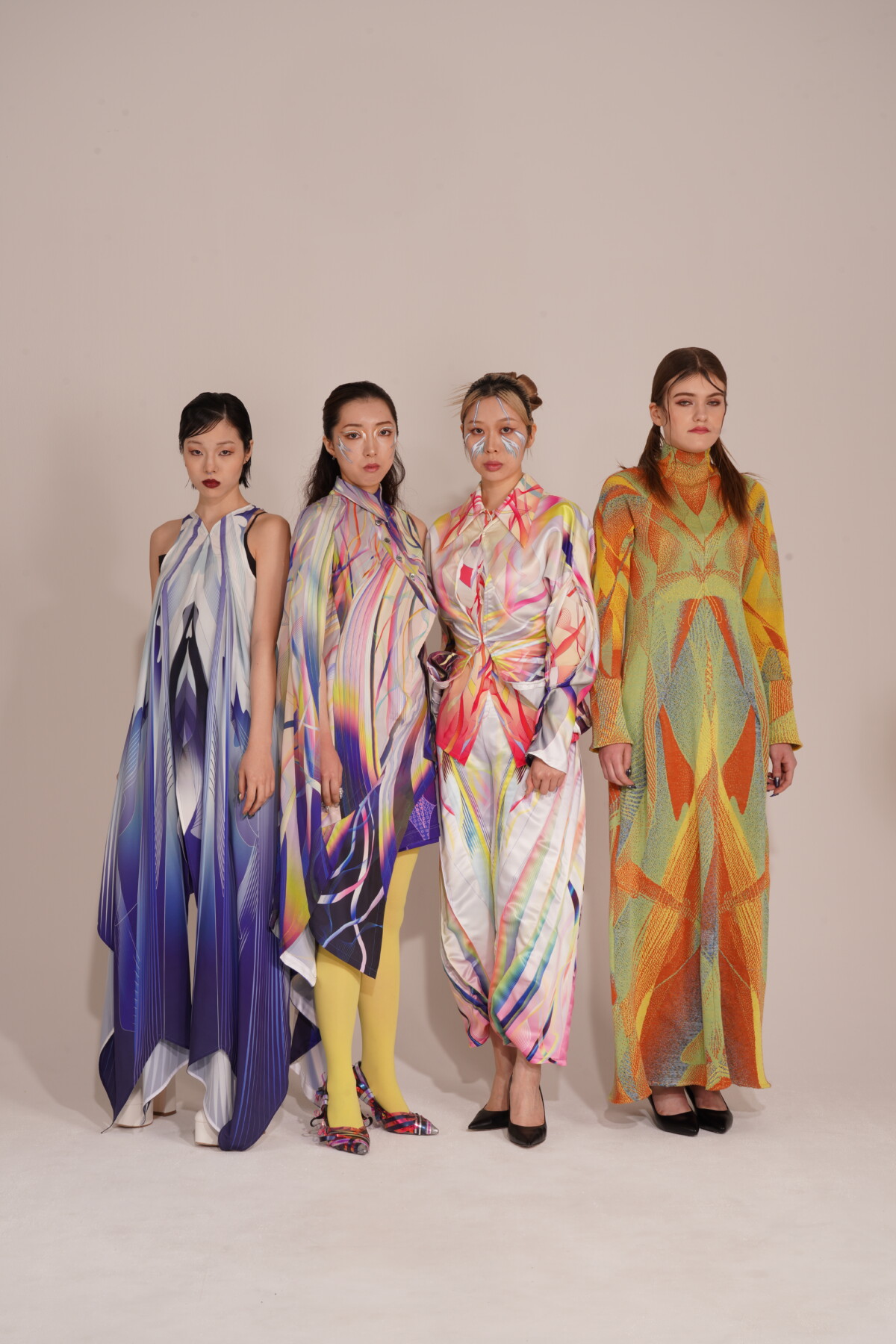 スローシャッターで撮影した時に写る“光のブレ”をテーマにしたコレクションです。光のブレの流動感や鮮やかさをデジタルプリントと曲線的なパターンで表現しました。ショーで歩く姿をイメージし、風でなびく軽やかな素材や色の見せ方にもこだわっています。CADでスキャンしたパターンに合わせて柄を一つひとつ作ったのも初めてで、ワクワクしながら制作しました。移動中に、急いで撮った写真はブレてしまい「失敗しちゃった」と、ネガティブな感情を持っていましたが、ある日、景色が混ざる瞬間や夜景の光が伸びている写真の美しさに気づきました。そんなネガティブな出来事をポジティブに捉える大切さを伝えたくてこのコレクションを制作しました。たくさんの方に支えていただき完成したショーで、本当に感謝しています。卒業しても個人制作は続けて、自分のコレクションをショーで発表するのが今後の目標です。【Instagram:@_hayuma_】