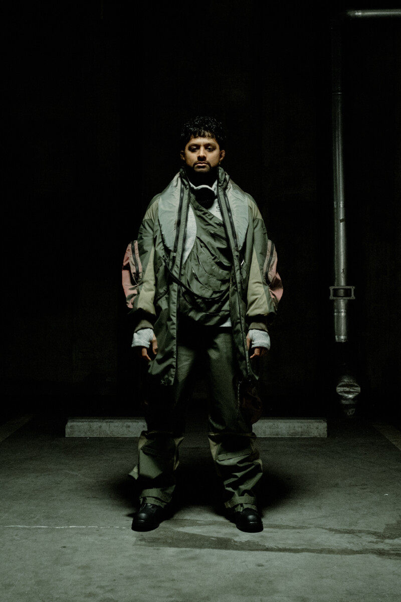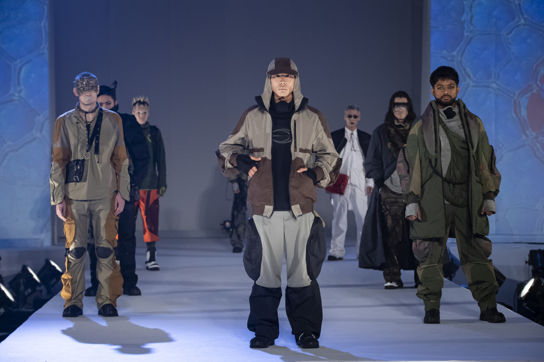 「K.E.R. -Kinetic Exo Relics-」をテーマに、変化する未来都市を旅するための“身体拡張型の遺物装備”を表現しました。ミリタリー×機能性×昆虫という自分の好きな要素を掛け合わせ、素材の伸縮性や撥水性といった機能面に加え、肌触りや光沢で昆虫らしさを取り入れています。さらに機能服のパターンを応用することで運動性を確保し、ディテールやステッチでミリタリーの要素を加えました。ショーの音楽は自分で制作し、ヘアメイクもサロンと綿密に打ち合わせを行い、各ルックにキャラクター性を持たせています。ショーでは映像や照明も重要な要素だと感じていたので、信頼している友人とともに空間演出を作り上げました。今後は修行期間として、さらに成長していきたいと考えています。【Instagram:@koyo.minami】