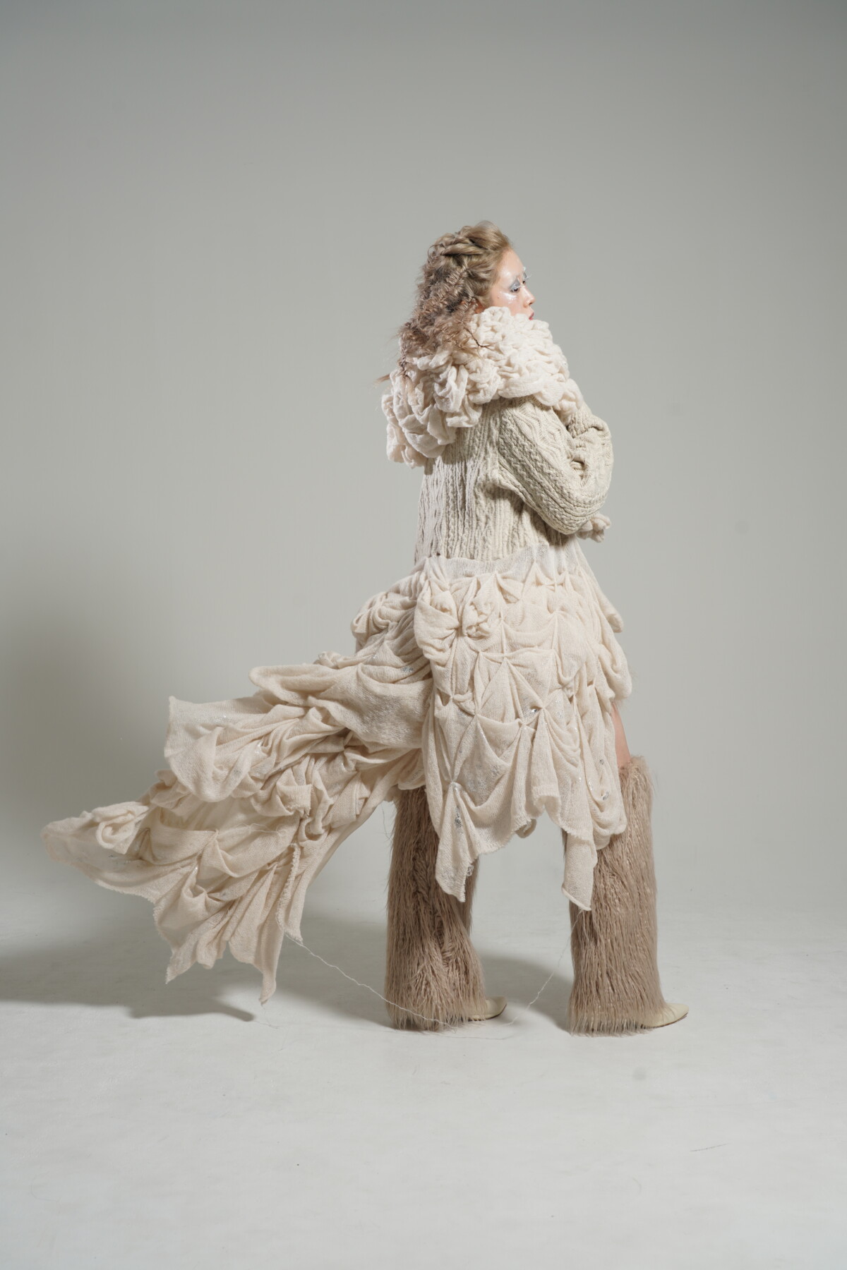 幼い頃から憧れてきた“可愛いアイドル”をテーマに、自分が思う理想像を全力で詰め込んだコレクションです。各ルック、メンバーカラーに合わせてオリジナルの惑星をイメージし、素材やデジタルプリントでデザインに反映しています。水色の“アワアワした惑星”は泡のような質感になるようスカートをもこもこに仕立て、オレンジの“トゲトゲの惑星”はコンピューターニットで質感から作り込んでいます。テーマに合わせて、ヘアメイク・音響・照明も“可愛い”に全振りしたカラフルで盛りだくさんな演出にしています。映像は友人に依頼し、私が制作した惑星を3Dに落とし込み、回転していく映像に仕上げました。また、インターン先でのご縁から、アイドルグループ「NEFRALISE」にウォーキングと音源のご協力をいただきました。卒業後は会社で働きながら衣装制作を続け、いずれは独立して、アイドル衣装制作一本で活動していくことを目指しています。【Instagram:@25chan_noa】