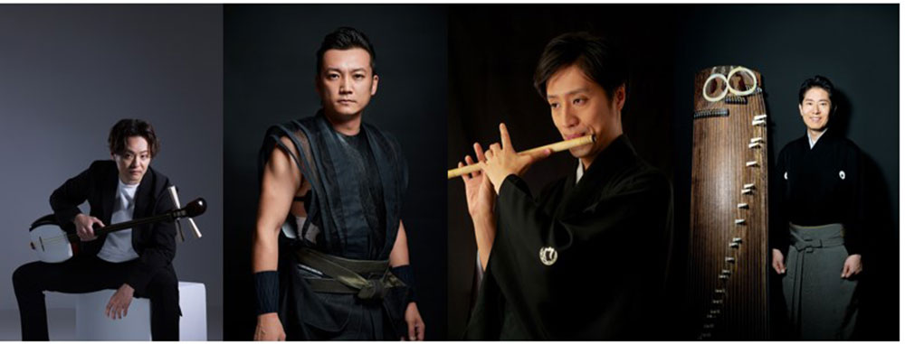 ”ART歌舞伎楽団”の面々。左から、津軽三味線の浅野祥さん、太鼓の山部泰嗣さん、笛の藤舎推峰さん、箏曲の中井智弥さん。