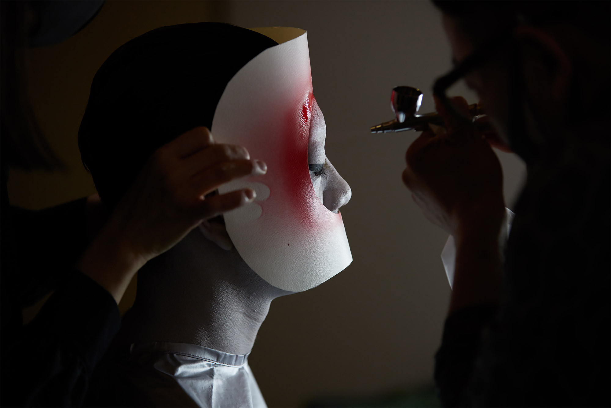 第4部、琵琶の語りによる創作舞踊劇「花のこゝろ」で、壱太郎さんは夫と子供を亡くした女を踊った。壱太郎さんのメイクは白塗りの顔に冨沢さんがエアブラシで大きな赤い円を描いたもの。長いつけまつげも印象的だ。edenworksによるドライフラワーのヘッドピースもこの女の情感を繊細に表現した。