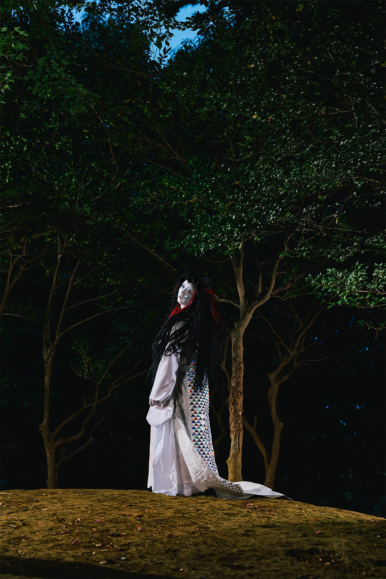 「ART道成寺」の清姫を演じる壱太郎さん。メイクは蛇を意識したもの。衣裳や烏帽子は元々の歌舞伎の『京鹿子娘道成寺』の衣裳から発想し、里山拓斗さんがデザインした。