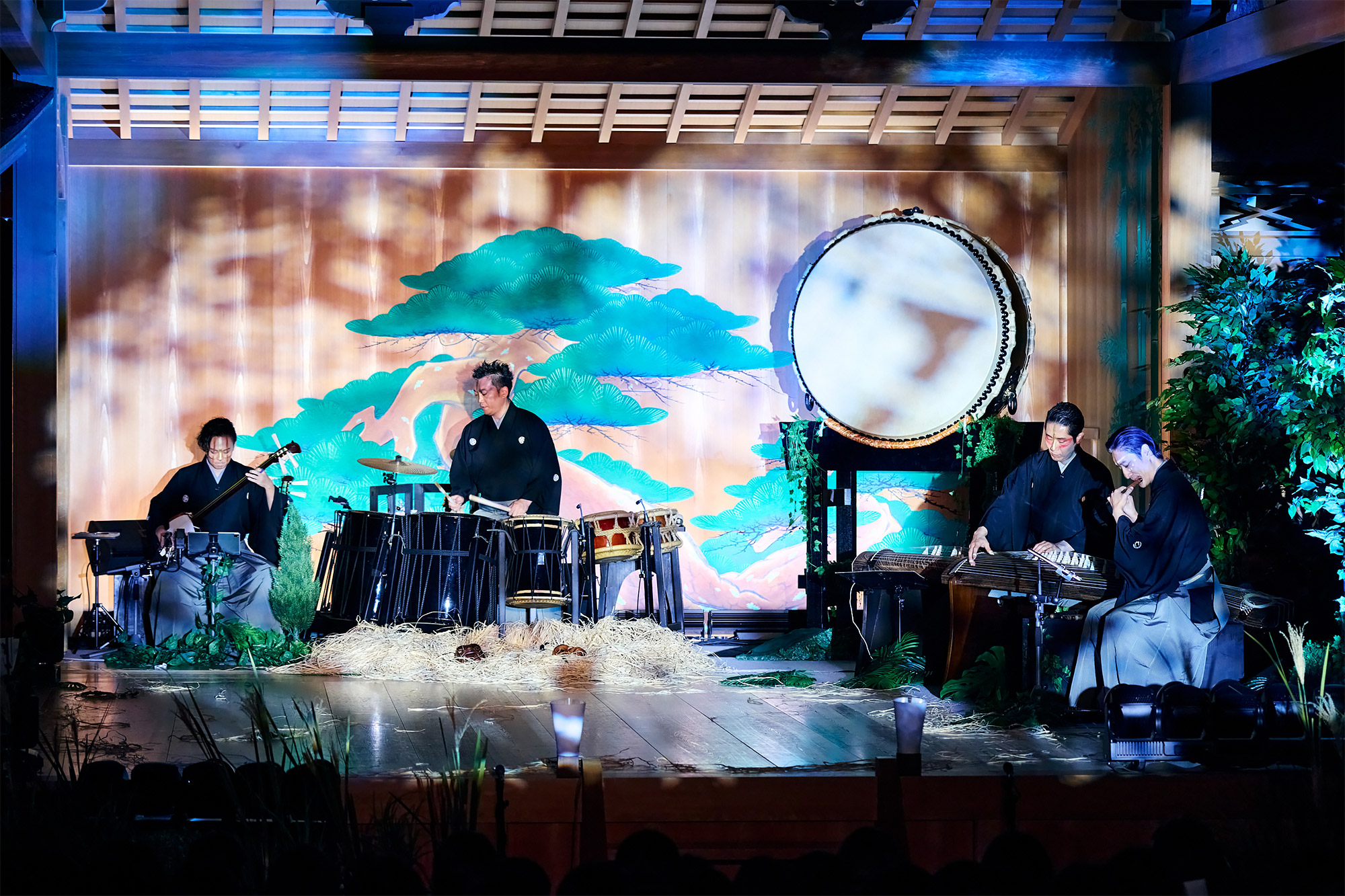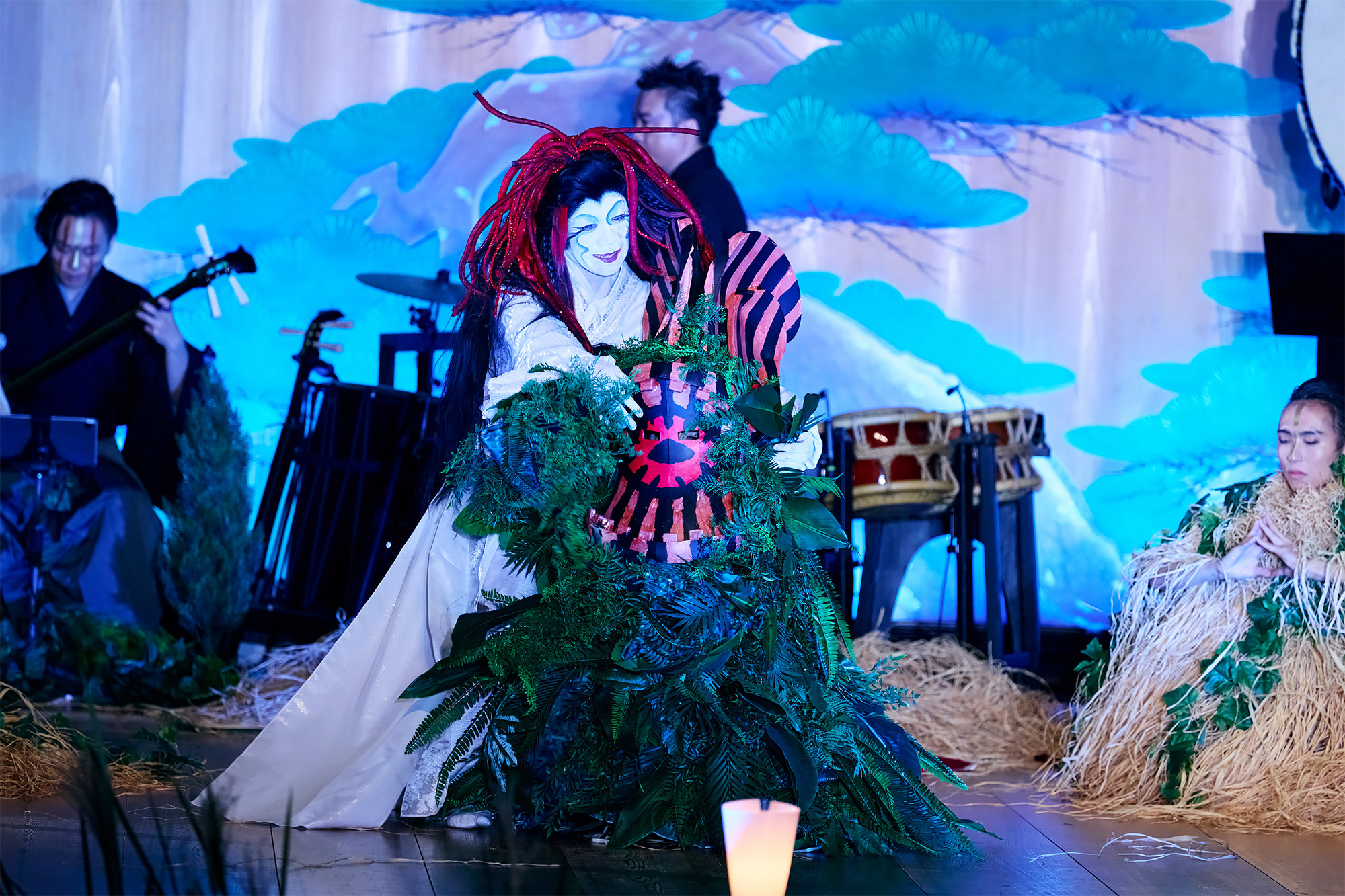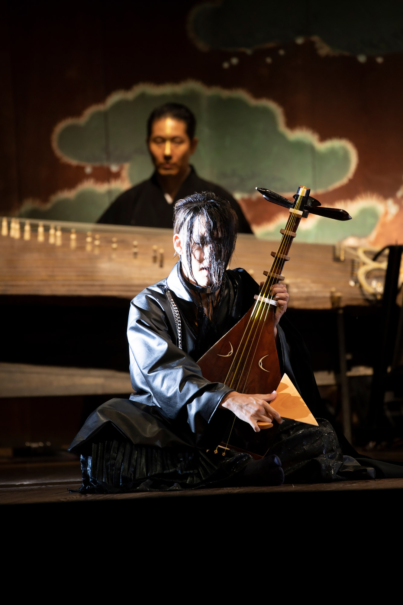 ついついヴィジュアル面に目がいきがちだが、さまざまな和楽器のコラボレーションがART歌舞伎の舞台を牽引している。「今までにない作品を作りたい」という壱太郎さんの思いを、津軽三味線、箏・二十五弦箏、笛、太鼓で構成された”ART歌舞伎楽団”が体現。洗練された伝統の音、土俗的で野性的な音、前衛的なとがった音……。ともすれば楽器や奏者の個性のミスマッチになりそうな組み合わせ。逆にそれが力強い音の世界を創り上げた。舞踊劇のBGMにとどまらない心揺さぶるサウンドが能楽堂に響き渡った。
