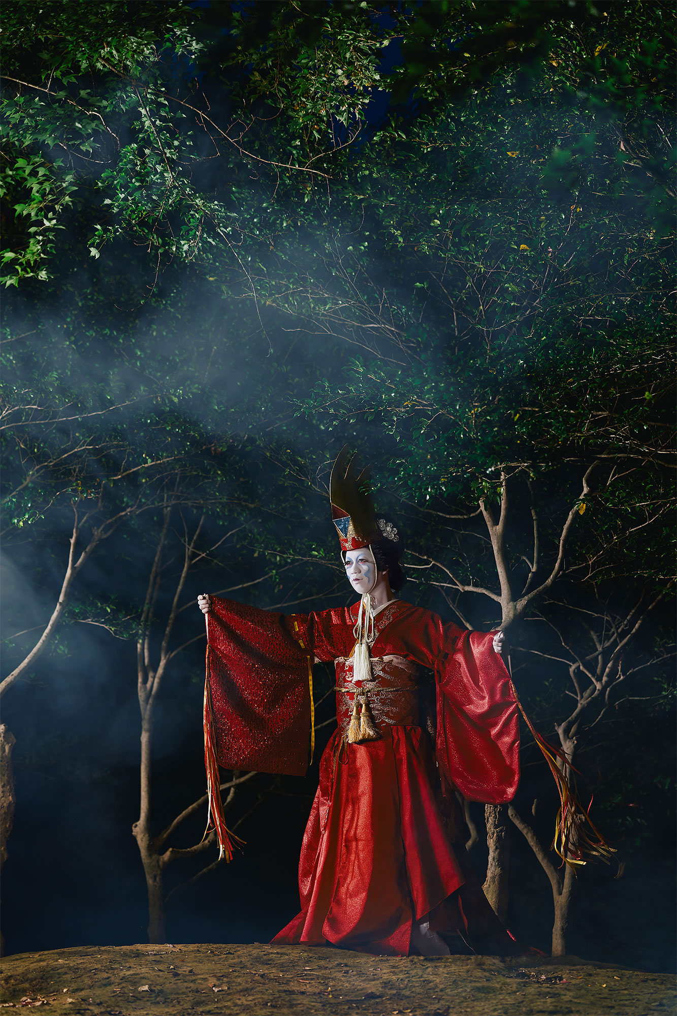 「ART道成寺」公演PR用に撮影された清姫に扮する壱太郎さん。赤い衣裳を引き抜いて蛇体という正体を見顕した清姫。早朝の森の中、三角のオーロラ箔のプリントを施しただらりの帯が蛇の鱗のように妖しく光る