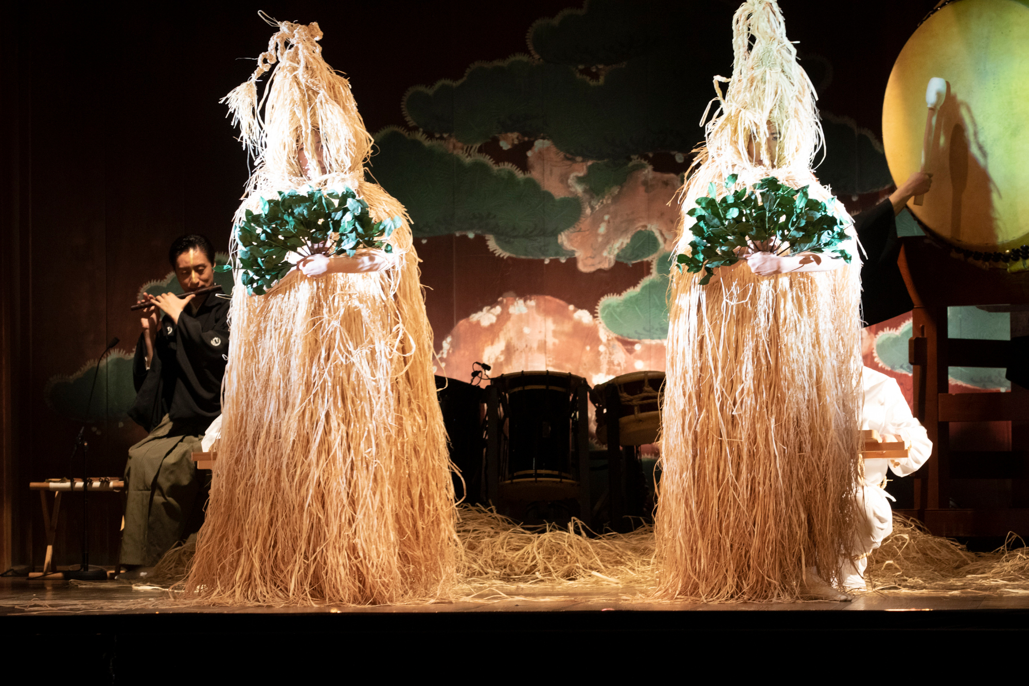 3部三番叟「祈望祭事」。壱太郎さんと右近さんが全身をすっぽりと簑で覆われるという奇抜な衣裳。五穀豊穣を祈願する山形県の奇祭がアイデアの原点。