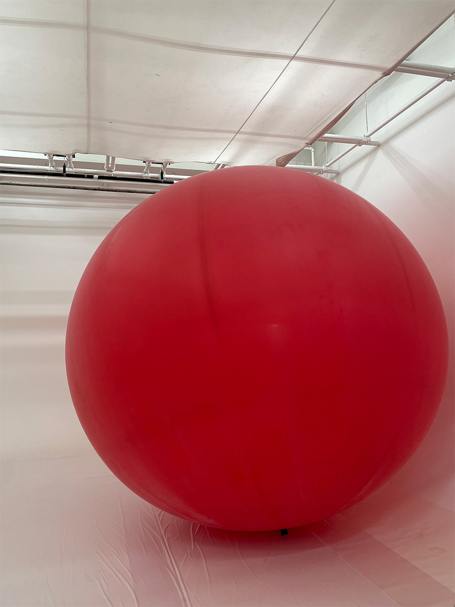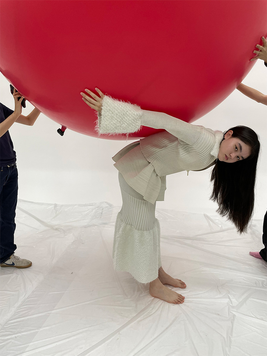 これは、本誌12月号、CFCLのファッション撮影の背景に使用することになった大きな風船です。ニットならではのグラフィカルなシルエットから想を得て、アートディレクターの大島慶一郎さんがアイディアを提案して下さいました。