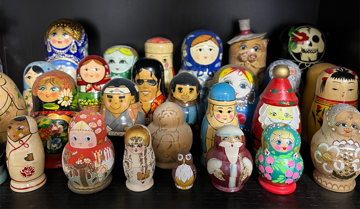マトリョーシカは、子孫繁栄や家庭円満の象徴として誕生したロシアの民芸品。幼いころに実家に飾ってあったもので、しょっちゅう遊んでいて、大人になってから少しずつ集めていくようになり、現在は40体ほど棚に並んでいます。