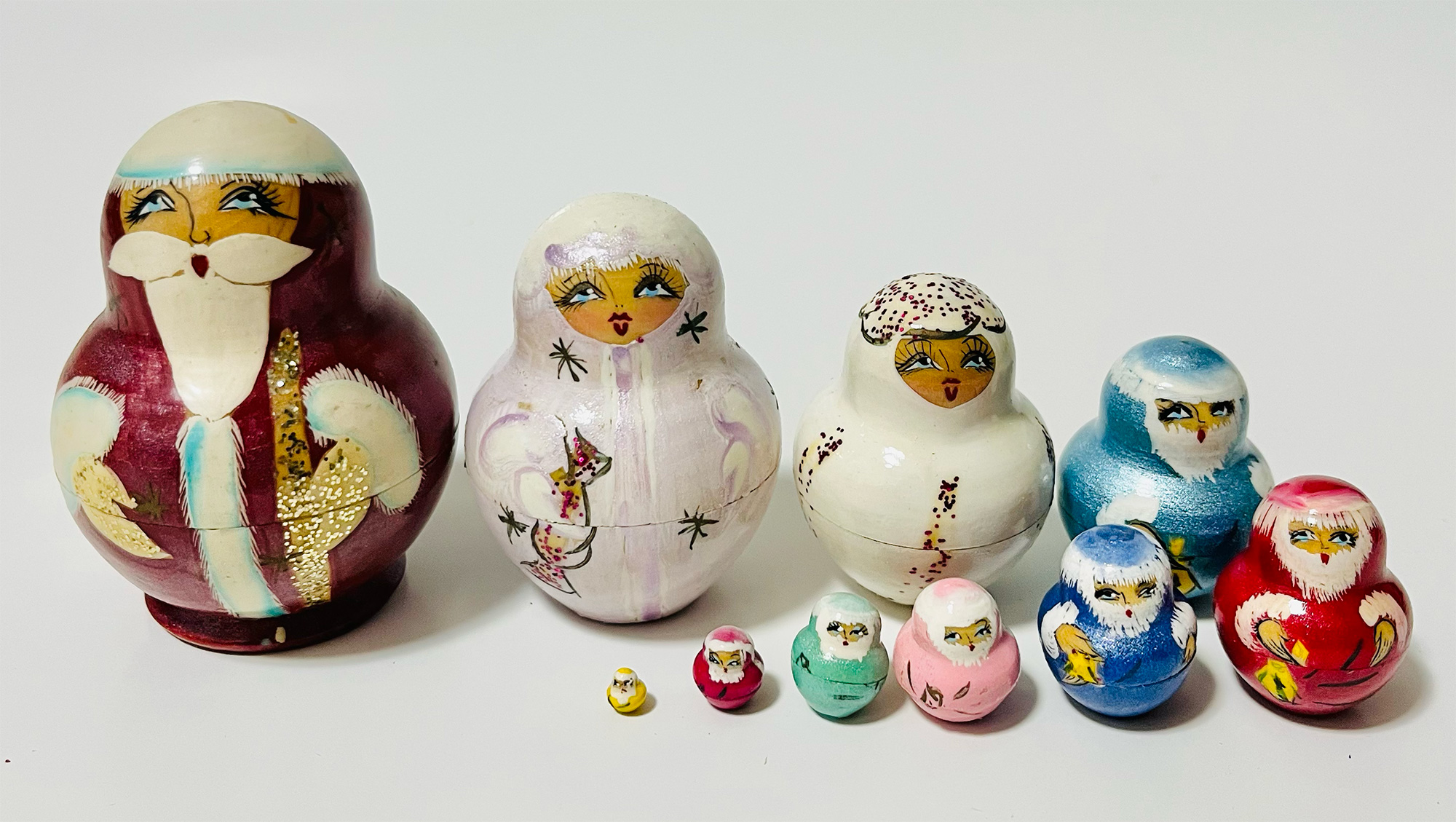 その第1号として初めて自分で購入したのは、25年くらい前のこと。表参道で露店を開いていた(今はほとんど見かけないですね)外国人の女性から。何気に見ていただけだったのですが、わずか7cmほどのサンタクロースに入れ子が9体も入っていて、一番小さなものは米粒くらい!絵付けも10体それぞれ違うことに感動して、即買いしました。