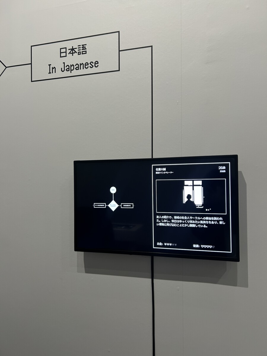 最後は木原共さんによる体験型の作品です。この作品ではなんと、AIで生成された統計的に日本に存在しうる架空の誰かの人生を、ゲームを通して追体験することができるんです。