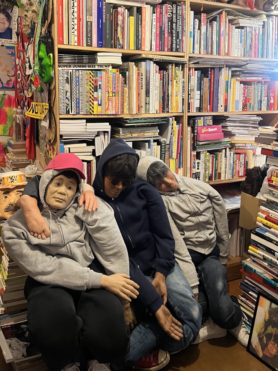 お笑いやアートに関する書籍の前で肩を組んでいるダミー人形