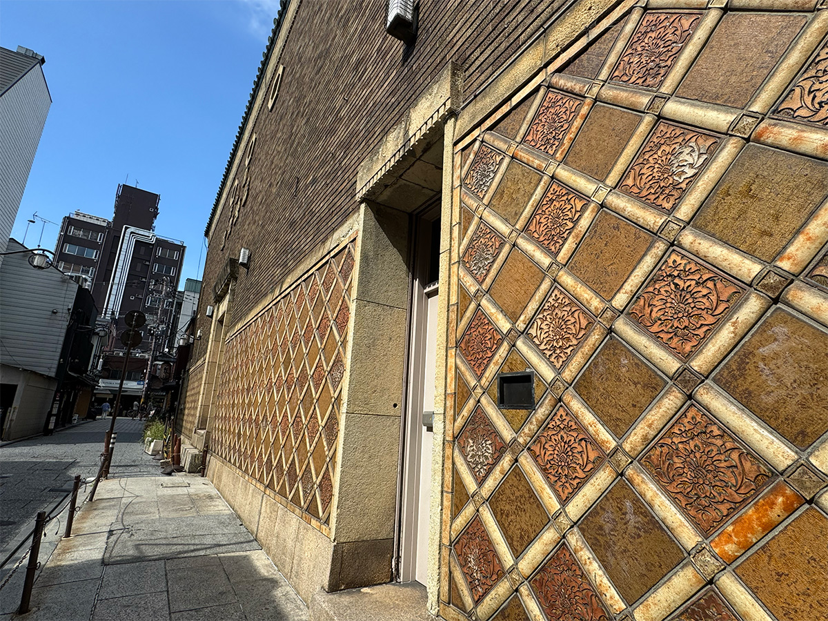 先斗町歌舞練場の正面。タイル使いが印象的で、下部には「なまこ壁」を思わせる意匠も見られる。昭和初期のモダンさと伝統的な表情が並ぶ外観
