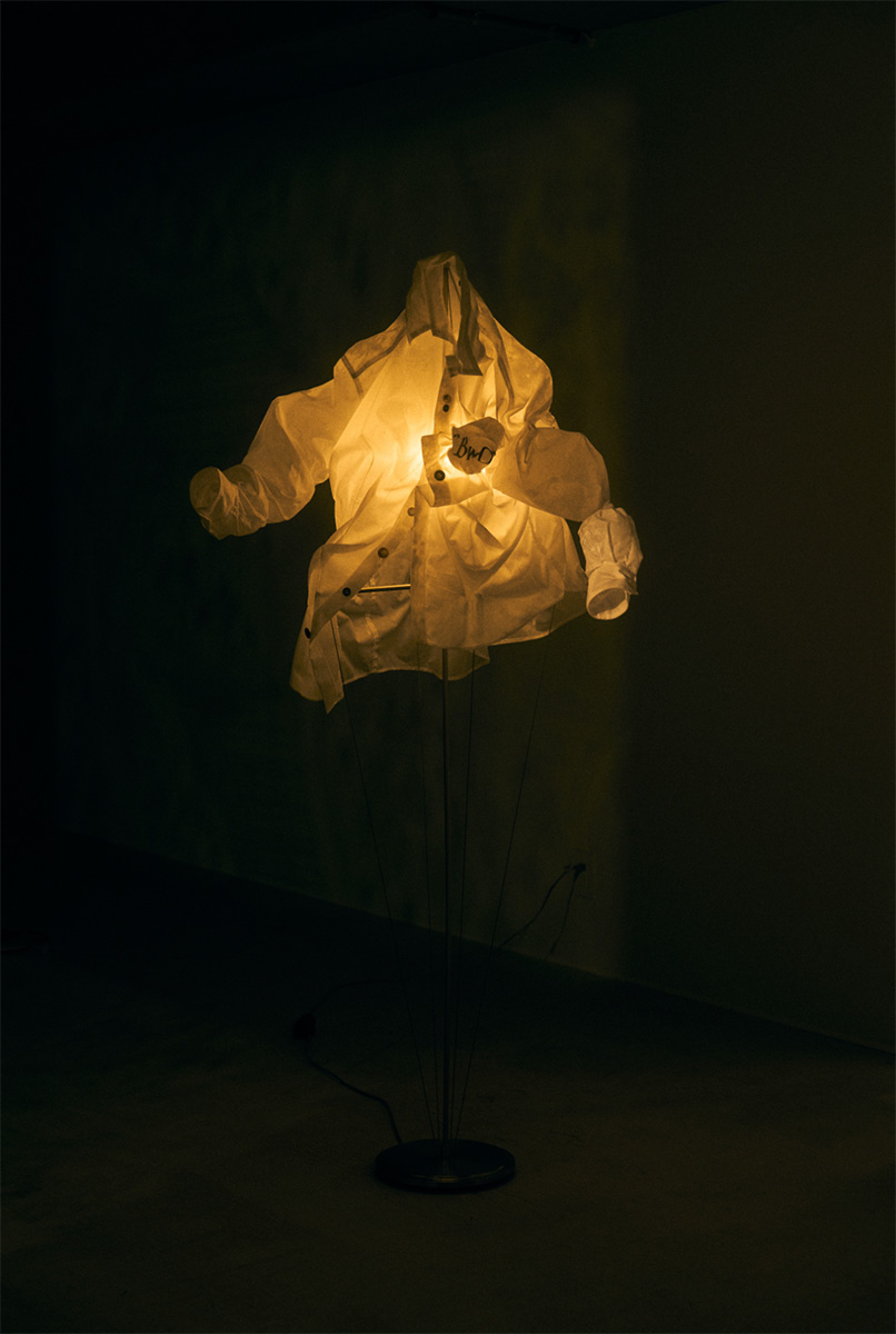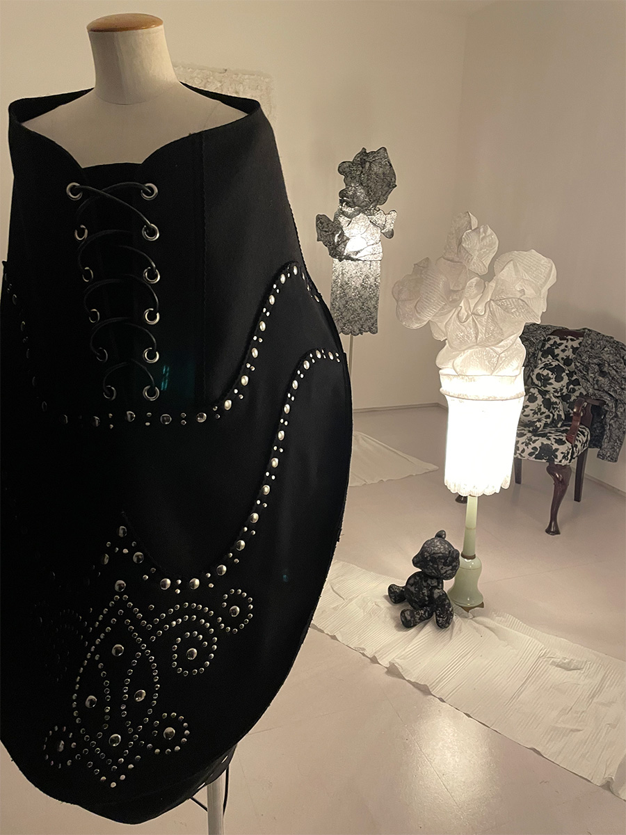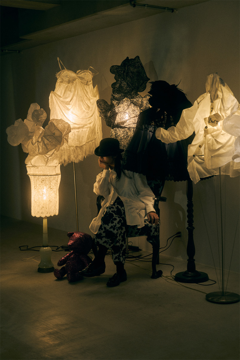ランプシェードに光が照らされると、空間に新たな存在感が際立ちます。山本さんの美意識の詰まった作品は、クリエイションの自由さを問いかけてきます。今年は、古着をテーマにした服作りやギャラリーでの展覧会など、いくつかの企画を検討中だそう。今後のJun.yの展開にぜひご注目ください!