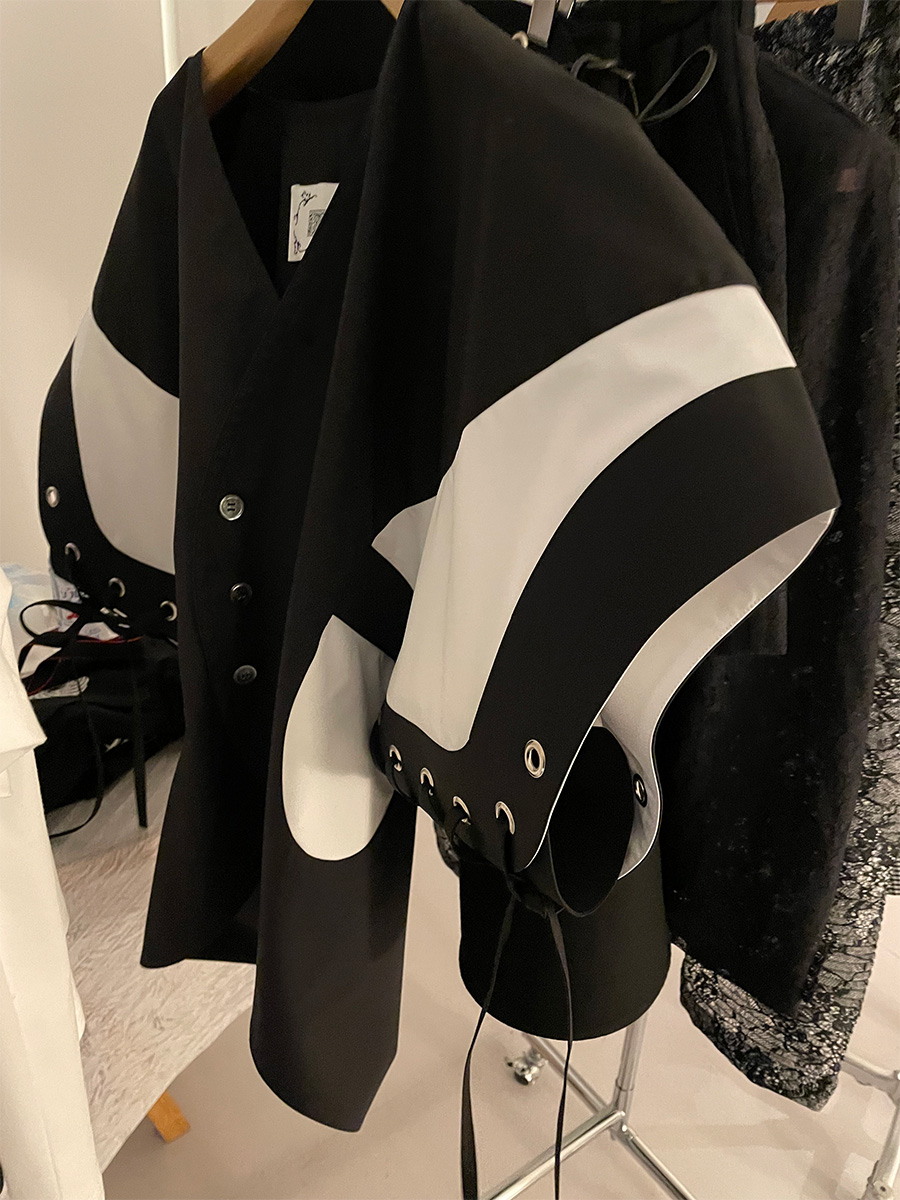 例えば、今回取り組んだのが“靴”。人が履き、地面と接するという機能を取り去ったら? そこで、靴を構造分解し、パターンを引いて、尾州のウールメルトンという硬い生地でドレスを制作しました。さらにジャケットやスカートも。まだまだ色々な可能性があると思います。