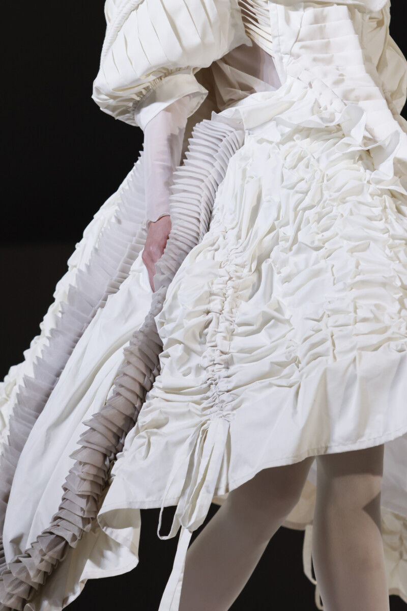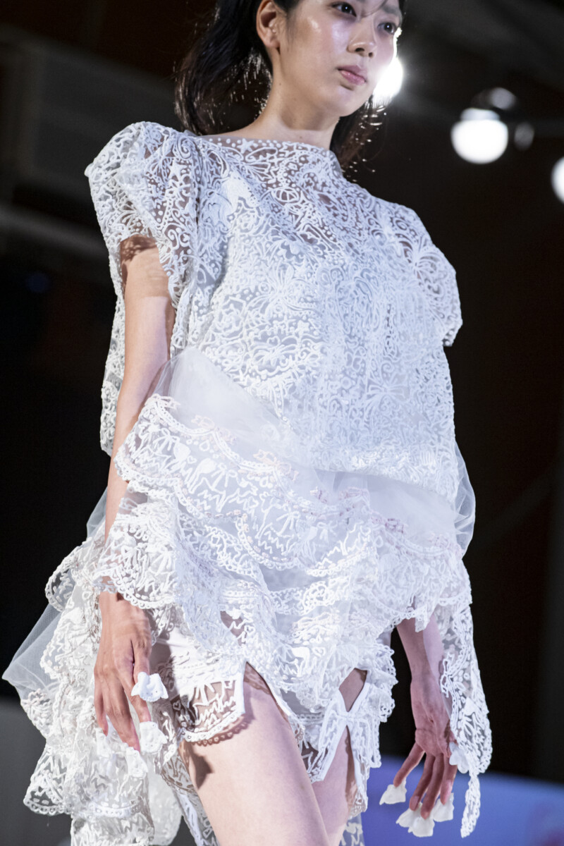 廣川玉枝先生(SOMARTAデザイナー)から選抜された池田空音さんは、骨をイメージしたダイナミックかつエレガントなドレスを制作。ギャザーやシャーリングが施されたドレスに何層にも重ねたオーガンジーのパーツがあしらわれた緻密なディテール。思わず「パターンはどうなっているの!?」と驚くほどの完成度でした。