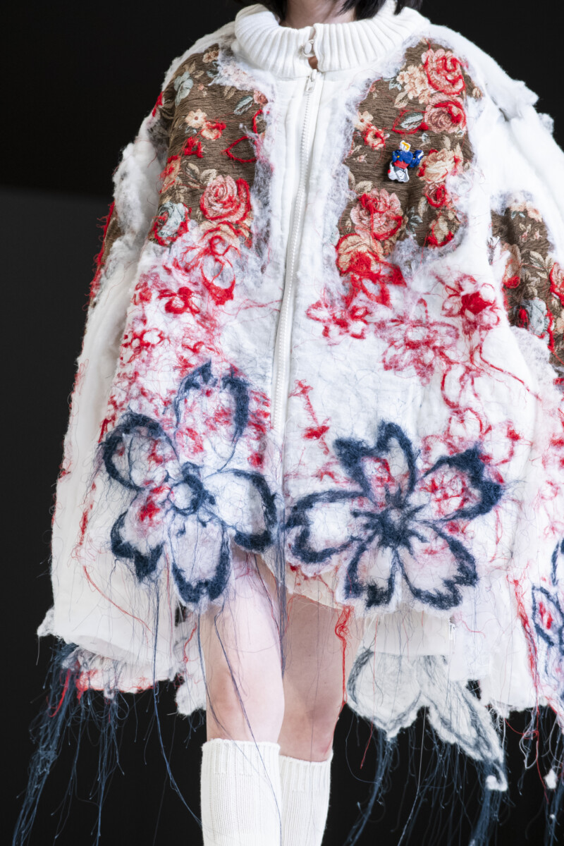 受賞こそ逃したものの、最終審査の来場者投票で3位に輝いたのは、田中文江先生(FUMIE TANAKAデザイナー)から選出された佐野結翔さん(Instagram:@snyuito)。糸をミシンで縫い付け、花柄やチェック柄を構築するという繊細な手法で制作。胸もとにはプラモデルをモチーフにしたコサージュが添えられていて、トータルでのコーディネートも非常に可愛らしく、惹きつけられる作品でした。