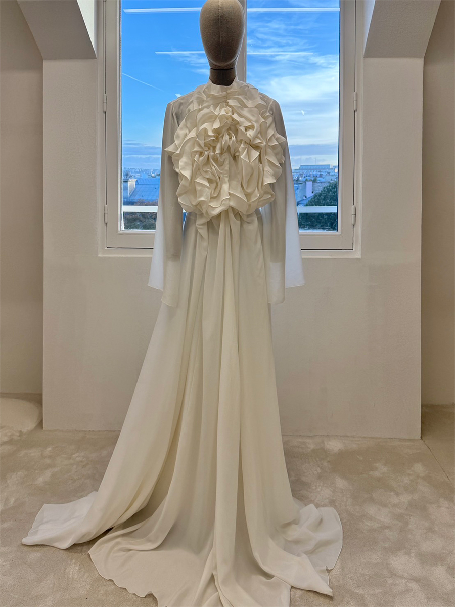 そして送られてきた写真を見ると、そこには美しく洗練された純白のドレスや樹脂で固めたというモードなジュエリーなど、クラシックとモダンが融合したアイテムの数々が。背景に映るパリの街並みともマッチしていて、感動のあまりひとりで思わずガッツポーズしていました。